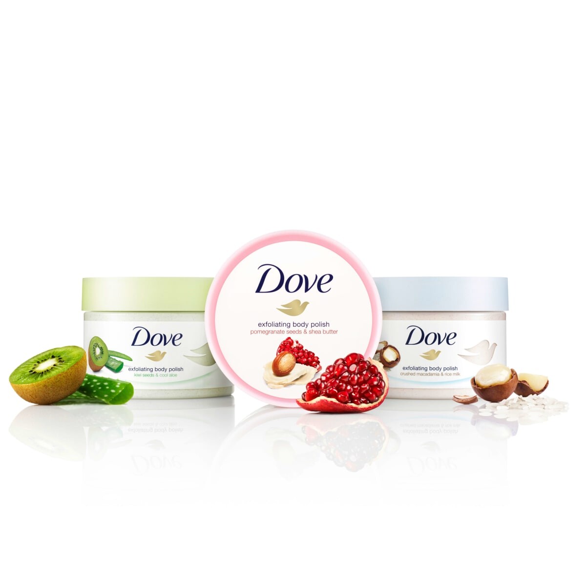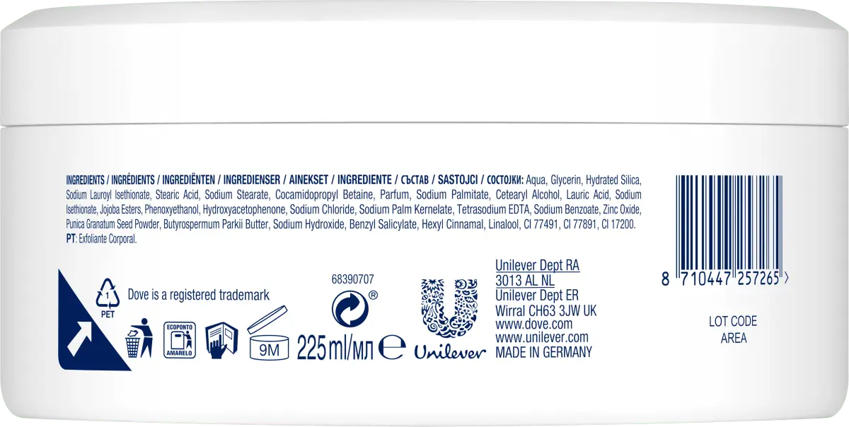 С кремом-пилингом для душа от Dove ваша кожа станет мягкой и эластичной. Он придает вашей коже приятный аромат граната и масла ши и удаляет омертвевшие клетки кожи с помощью пилинговых частиц на натуральной основе. Формула обеспечивает успокаивающее увлажнение и защищает кожу от высыхания. Для ощущения питательной и шелковисто-мягкой кожи.