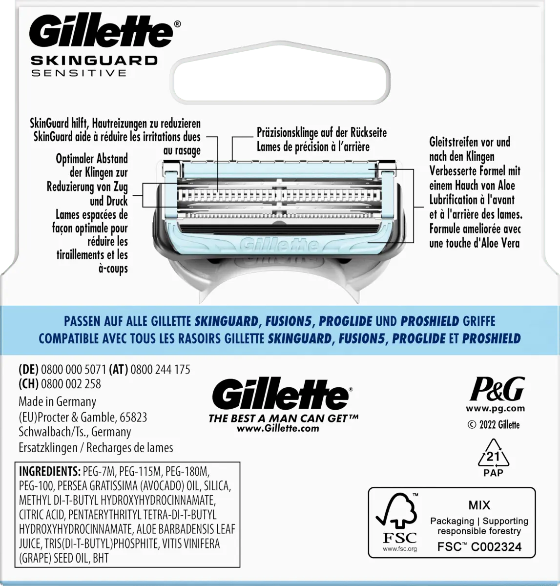 Лезвия Gillette SkinGuard Sensitive были специально разработаны для бритья неровной, загрязненной и раздраженной кожи. Уникальная технология SkinGuard защищает кожу от контакта с лезвием, помогая уменьшить раздражение кожи. Кроме того, два лезвия с низкой необходимой силой стрижки предотвращают выдергивание и выдергивание волос.