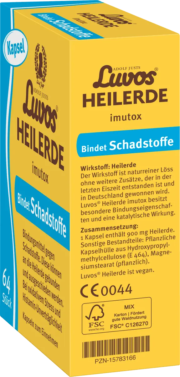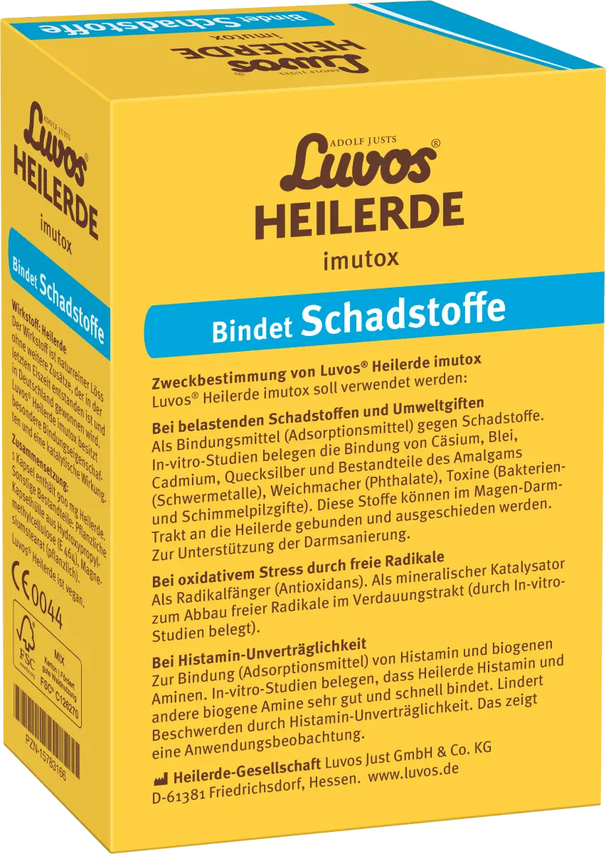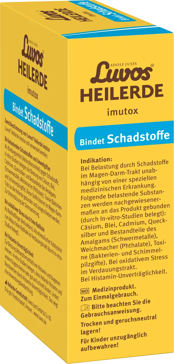 br>Целительная глина Luvos imutox обладает особыми связующими свойствами (принцип адсорбции и ионного обмена). Исследования (in vitro) показывают, что лечебная глина Luvos способна связывать свинец, кадмий, ртуть, компоненты амальгамы (тяжелые металлы), пластификаторы (фталаты) и токсины (бактериальные и плесневые яды). Эти вещества могут связываться с целебной глиной в желудочно-кишечном тракте и выводиться из организма. Свободные радикалы также могут вызвать окислительный стресс. Лечебная глина Luvos является минеральным катализатором. Исследования (in vitro) показывают, что лечебная глина Luvos является поглотителем радикалов. Неинтервенционное исследование также показывает, что прием лечебной глины Luvos imutox улучшает типичные симптомы непереносимости гистамина и что пострадавшие могут обойтись без диеты с низким содержанием гистамина. Лечебная глина Luvos - натуральный, чистый лесс без каких-либо других добавок.