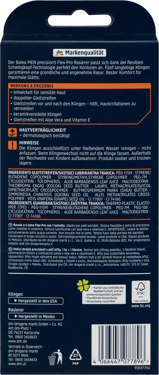 Бритва Balea MEN Precision5 Flex-Pro идеально адаптируется к контурам благодаря технологии гибкой качающейся головки. 5 долговечных лезвий гарантируют чистое и комфортное бритье. Это обеспечивает максимальный комфорт и максимальную гладкость.
