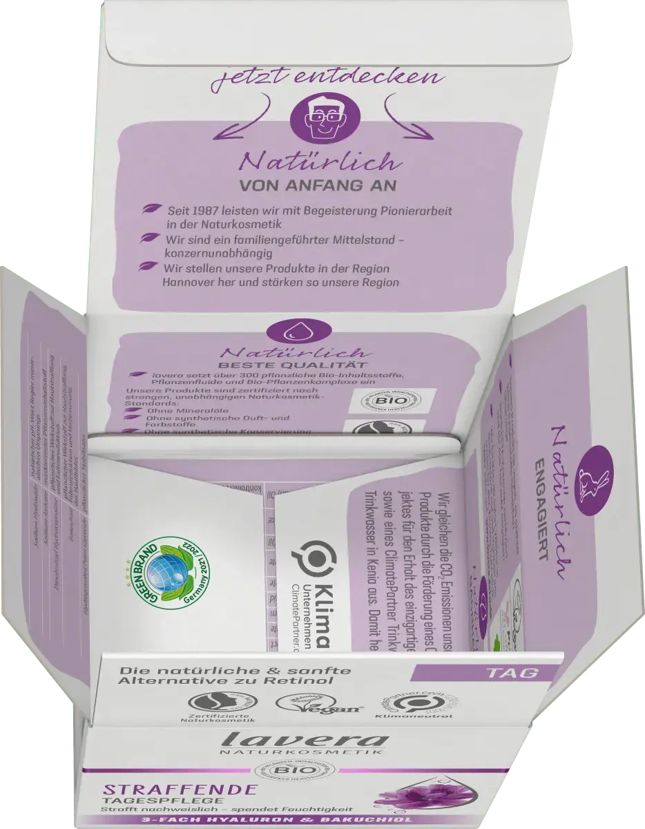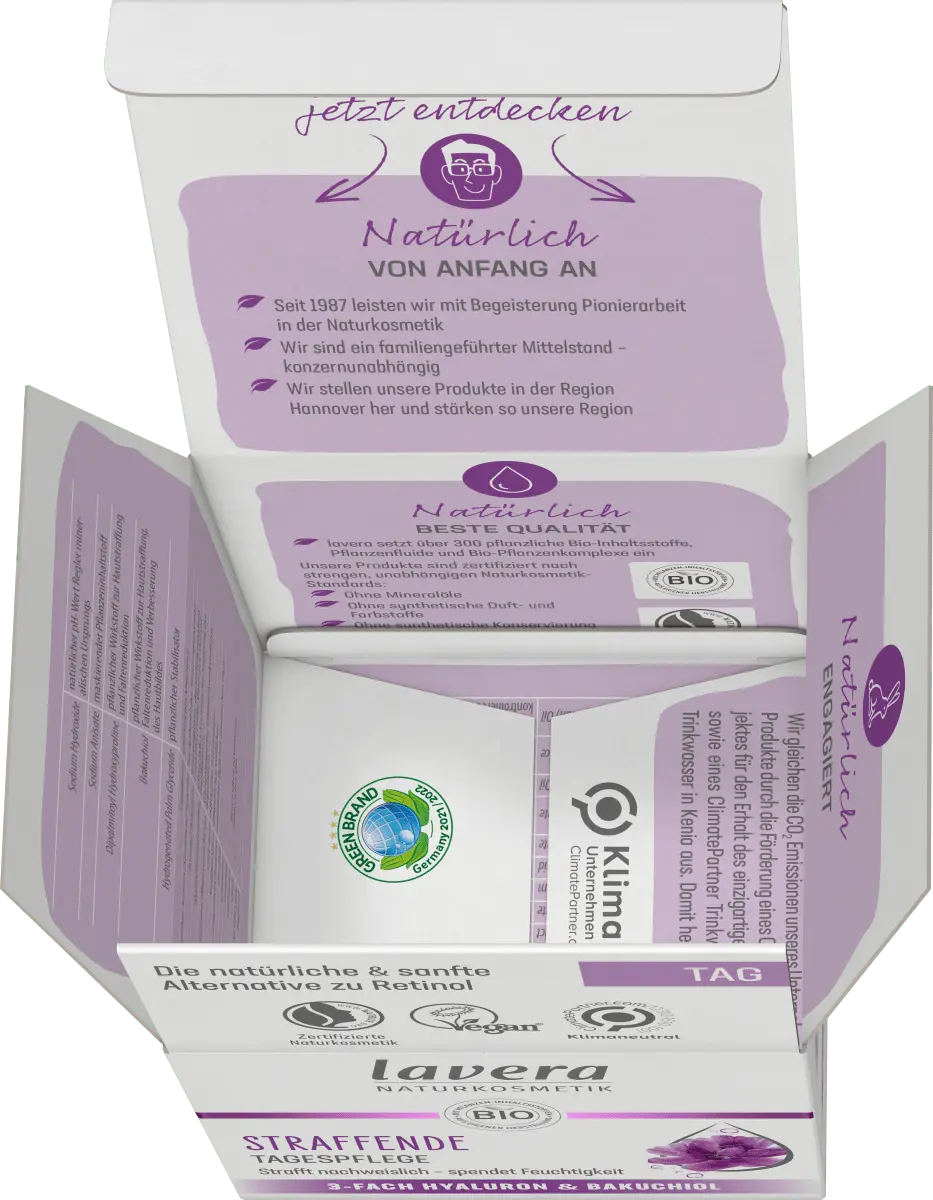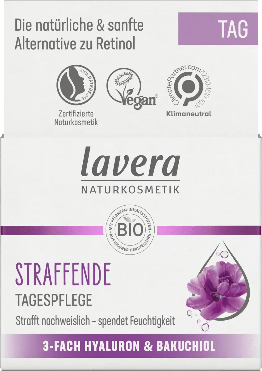 Укрепляющий дневной уход от Lavera с тройной гиалуроновой кислотой и мощным активным ингредиентом. Бакучиол естественным образом влияет на процесс старения кожи. Доказано, что высокоэффективная и хорошо переносимая формула стимулирует собственную коллагеновую систему кожи и уменьшает морщины. Почувствуйте, как быстро впитывающаяся текстура нежно тает на вашей коже, обеспечивая ей интенсивное увлажнение и уход, делая цвет лица более упругим, свежим и ровным. Гиалуроновая кислота – настоящее чудо увлажнения, повышает влажность кожи и тем самым эффективно сокращает морщины. С другой стороны, бакучиол, который он содержит, является мягкой и естественной альтернативой ретинолу. Мощный активный ингредиент, полученный из индийского растения Бабчи, поддерживает развитие коллагеновой системы кожи. Совместимость также подтверждена дерматологически.