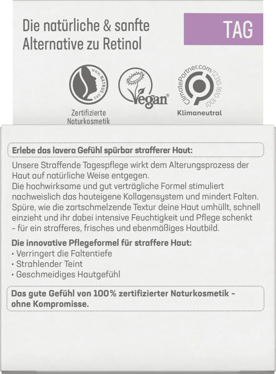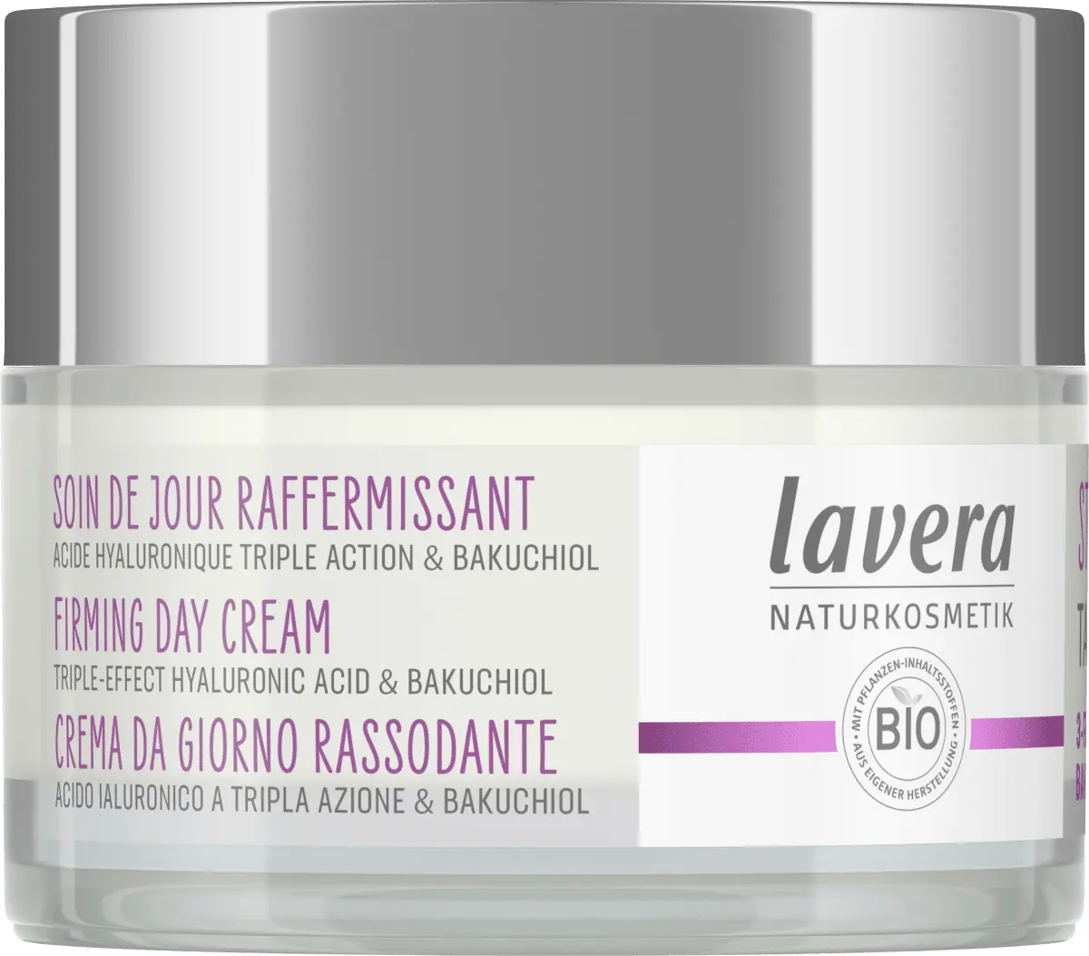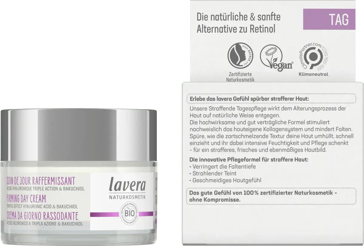Укрепляющий дневной уход от Lavera с тройной гиалуроновой кислотой и мощным активным ингредиентом. Бакучиол естественным образом влияет на процесс старения кожи. Доказано, что высокоэффективная и хорошо переносимая формула стимулирует собственную коллагеновую систему кожи и уменьшает морщины. Почувствуйте, как быстро впитывающаяся текстура нежно тает на вашей коже, обеспечивая ей интенсивное увлажнение и уход, делая цвет лица более упругим, свежим и ровным. Гиалуроновая кислота – настоящее чудо увлажнения, повышает влажность кожи и тем самым эффективно сокращает морщины. С другой стороны, бакучиол, который он содержит, является мягкой и естественной альтернативой ретинолу. Мощный активный ингредиент, полученный из индийского растения Бабчи, поддерживает развитие коллагеновой системы кожи. Совместимость также подтверждена дерматологически.