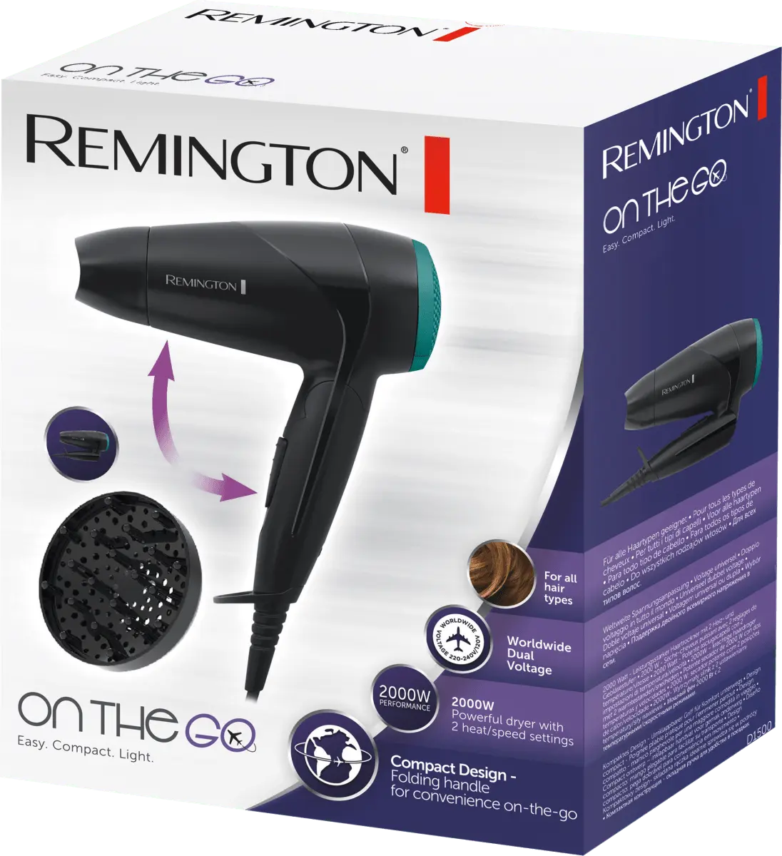 Фен REMINGTON D1500 имеет складную ручку, которая позволяет экономить место. хранилище. Он имеет 2 комбинированных уровня обогрева и вентиляции и скорость воздушного потока 60 км/ч. Насадка для укладки и компактный диффузор обеспечивают дополнительную густоту и объем. Фен имеет съемный и легко очищаемый воздушный фильтр, а также петлю для подвешивания.