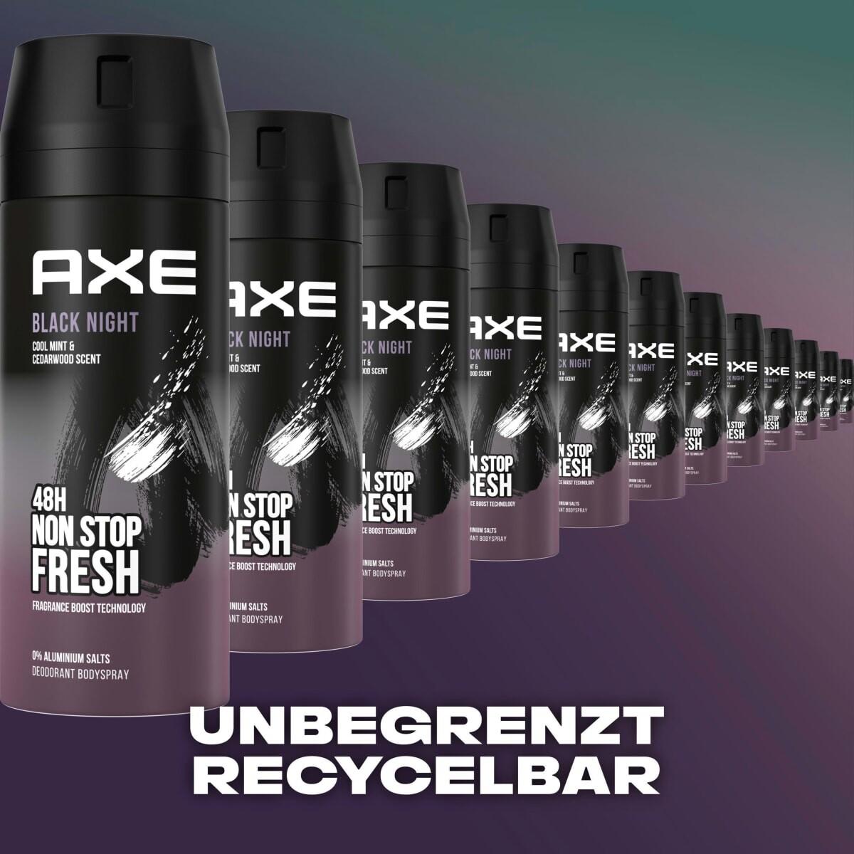 Спрей для тела AX Black Night без алюминия эффективно защищает от запаха тела. Аромат волнующий, чувственный и завораживающий. Его верхняя нота сочетает в себе меланж кардамона, корня имбиря, грейпфрута и груши. За нотой сердца следуют теплые ноты кашемирового дерева, цветов апельсина, ягод душистого перца, лаванды и герани, дополненные нюансами ванили, бобов тонка, янтаря и кедра.