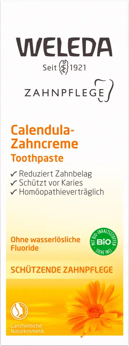 Естественная профилактика кариеса без ментола. Зубная паста «Календула» без ментола с минеральным чистящим средством на основе карбоната кальция бережно, но тщательно очищает зубы. . Регулярная чистка удаляет налет и тем самым надежно защищает зубы от кариеса. Экстракт календулы предотвращает симптомы воспаления и помогает сохранить здоровье всей полости рта. Мягкое эфирное масло фенхеля придает ощущение свежести во рту. Применение: Нанесите на зубную щетку примерно 2 см зубной пасты календулы, очистите зубы и десны небольшими круговыми движениями. Применение: - Натуральный уход за зубами без ментола - Ощущение свежести во рту - Предотвращает воспаление и помогает сохранить здоровье полости рта