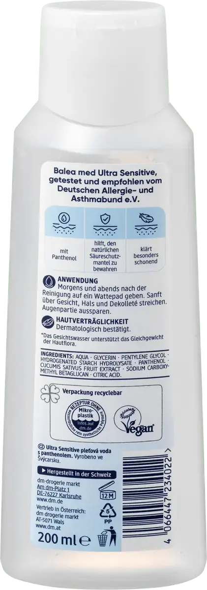 Тоник для лица Balea MED Ultra Sensitive с пантенолом помогает сохранить естественную защитную кислотную мантию кожи. Он очищает особенно мягко и поддерживает естественный баланс флоры кожи. Протестировано и рекомендовано Немецкой ассоциацией аллергиков и астматиков. Рецепт без микропластика и водорастворимых, чисто синтетических полимеров. Продукт соответствует Руководству по красоте Balea Clean - www.dm.de/balea