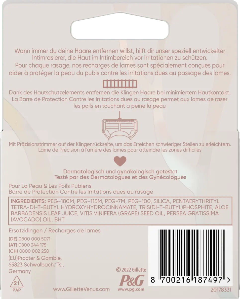 >Сменные лезвия Gillette Satin Care были специально разработаны для чувствительной интимной зоны. Запатентованный элемент защиты кожи и идеально выровненное расстояние между лезвиями обеспечивают минимальный контакт с чувствительной кожей. Таким образом, вы сможете наслаждаться чистым и свежим результатом бритья без неровностей.