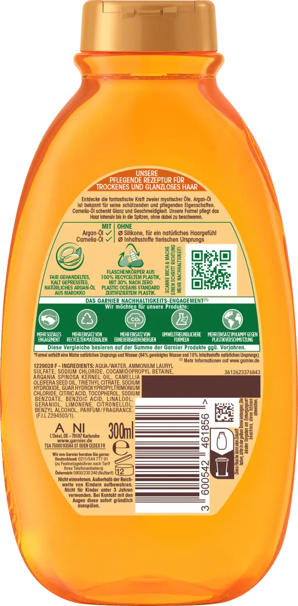 ИНГРЕДИЕНТЫ: ВОДА / ВОДА • ЛАУРИЛСУЛЬФАТ АММОНИЯ • ХЛОРИД НАТРИЯ • КОКАМИДОПРОПИЛ БЕТАИН • МАСЛО АРГАНИИ СПИНОЗЫ • МАСЛО СЕМЯН КАМЕЛИИ ОЛЕИФЕРНОЙ • ТРИЭТИЛЦИТРАТ • ГИДРОКСИД НАТРИЯ • ГУАР ГИДРОКСИПРОПИЛТРИМОНИЯ ХЛОРИД • ЛИМОННАЯ КИСЛОТА • ТОКОФЕРОЛ • БЕНЗОАТ НАТРИЯ • БЕНЗОЙНАЯ КИСЛОТА • ЛИНАЛООЛ • ГЕРАНИОЛ • ЛИМОНЕН • ЦИТРОНЕЛЛОЛ • БЕНЗИЛОВЫЙ СПИРТ • ДУХИ/АРОМАТИКА (F.I.L. Z294503/1).