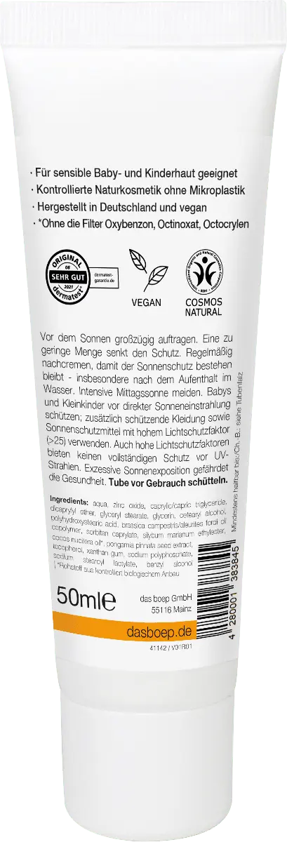 Область применения: Лицо, Тело Содержащий солнцезащитный фактор: 50 Тип кожи: Нормальная, Чувствительная/Чувствительная Характеристики продукта: Особенно подходит для лица, Особенно подходит для детей, Минеральная солнцезащитный фильтр, С солнцезащитным фактором (SPF), Без красителей, без парабенов, без парафинов/минеральных масел, без отдушек, для чувствительного ухода, веганский, вегетарианский Текстура/консистенция/применение: крем/мусс Другие особенности продукта