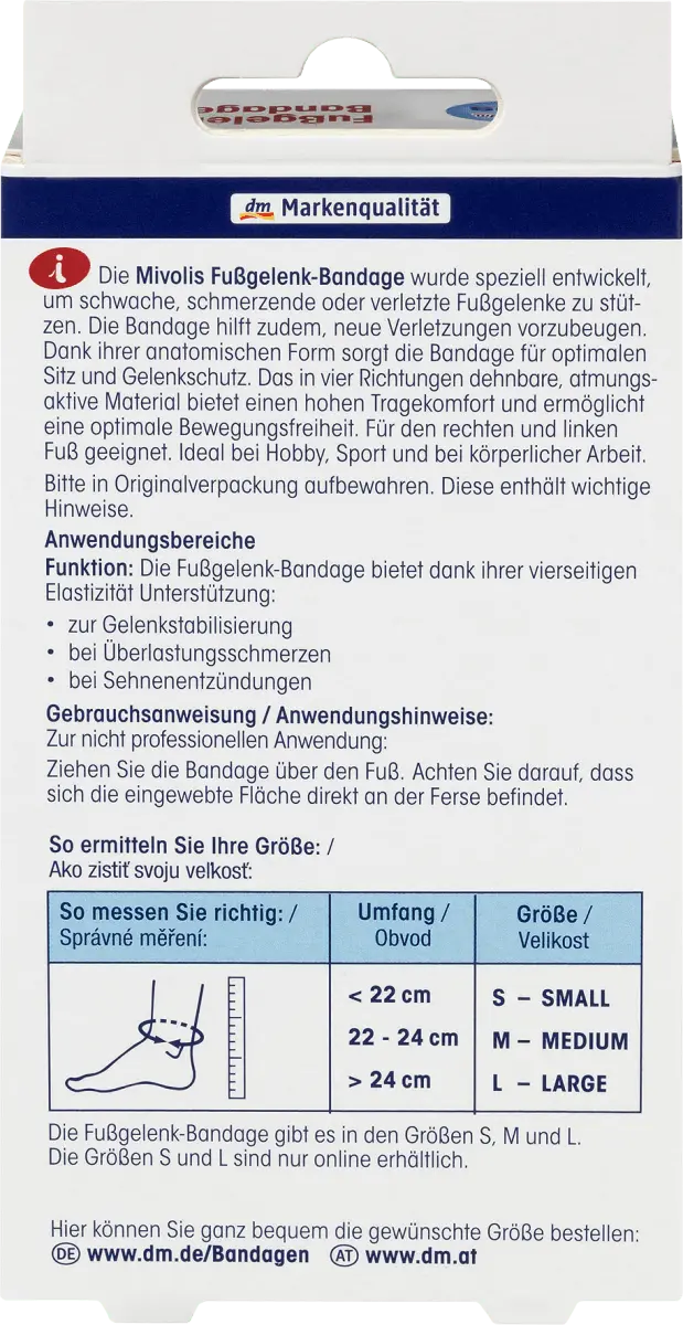 br> Повязка на лодыжку Mivolis S была специально разработана для поддержки слабых, болезненных или поврежденных лодыжек. Повязка также помогает предотвратить новые травмы. Благодаря своей анатомической форме повязка обеспечивает оптимальную посадку и защиту суставов. Растягивающийся в четырех направлениях дышащий материал обеспечивает высокий уровень комфорта и высокую степень свободы движений. Подходит для правой и левой ноги. Бандаж идеален для хобби, спорта и физической работы. Области применения: Функция: Благодаря четырехсторонней эластичности бандаж на голеностопный сустав обеспечивает поддержку: - для стабилизации сустава - при болях от чрезмерной нагрузки - при тендините. br>Обязательная информация