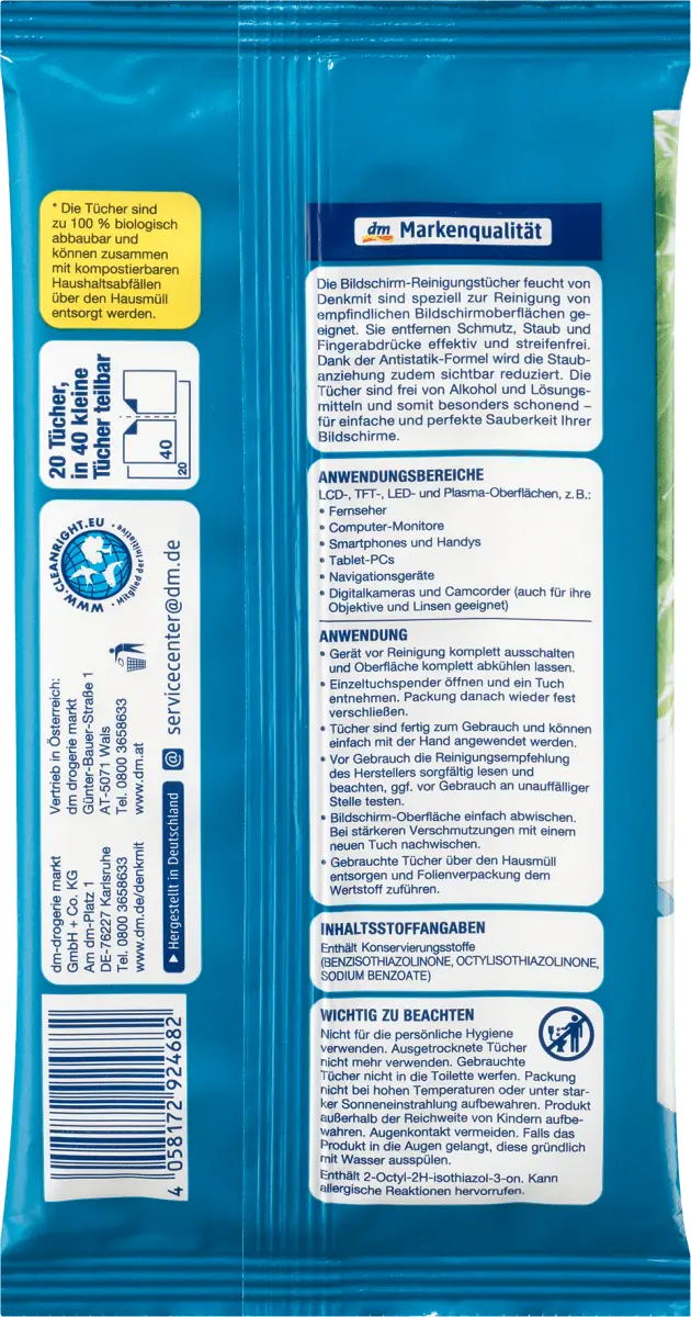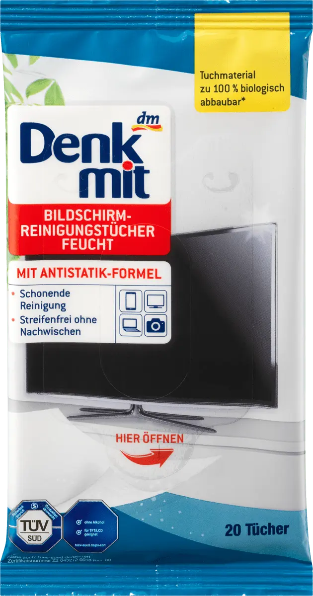 Влажные салфетки для очистки экрана от Denkmit особенно подходят для очистки чувствительных поверхностей экрана. Они эффективно удаляют грязь, пыль и отпечатки пальцев, не оставляя разводов. Благодаря антистатической формуле притяжение пыли заметно снижается. Салфетки не содержат спирта и растворителей и поэтому особенно нежны - для легкой и идеальной очистки ваших экранов.