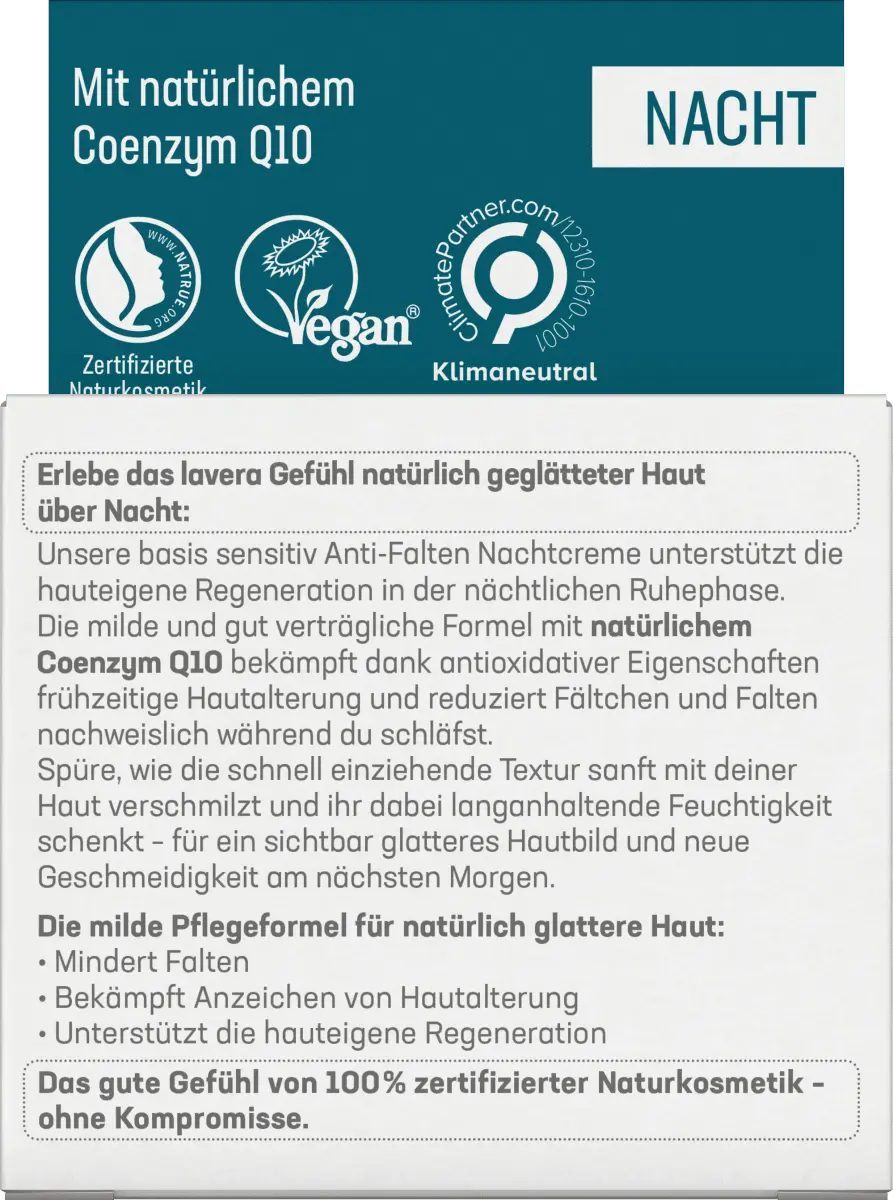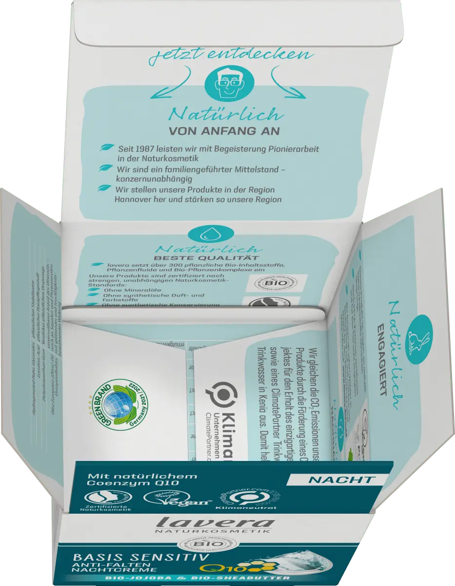 С помощью ночного крема Lavera Sensitive против морщин Q10 вы сможете ощутить ощущение гладкой кожи за ночь. Крем против морщин с органическим жожоба и органическим маслом ши поддерживает регенерацию вашей кожи во время ночного отдыха. Его формула с коэнзимом Q10 обладает антиоксидантными свойствами и, таким образом, борется с преждевременным старением кожи. Доказано, что оно уменьшает тонкие линии и морщины во время сна. С кремом вы сделаете кожу заметно более гладкой и эластичной.