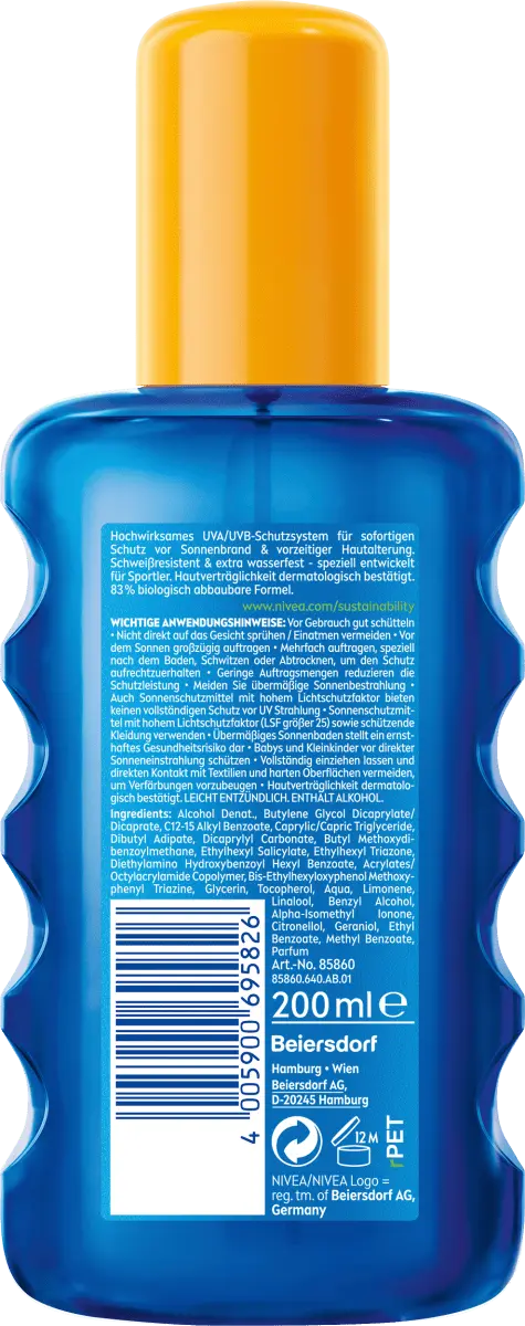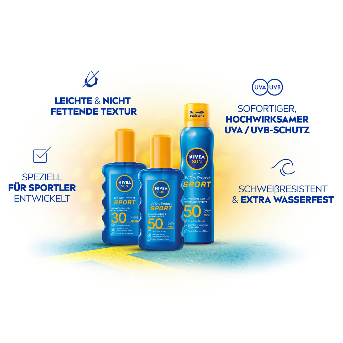 Солнцезащитный спрей UV Dry Protect Sport SPF 50 обеспечивает немедленную защиту от UVA и UVB от солнечных ожогов и преждевременного повреждения кожи. Прозрачная формула с мгновенным подсушивающим эффектом, специально разработанная для спортсменов, не оставляет белых следов и оставляет на коже ощущение сухости. NIVEA поставила перед собой цель минимизировать свое воздействие на окружающую среду. Вот почему формула солнцезащитного спрея не содержит вредных для окружающей среды УФ-фильтров октиноксата и оксибензона и на 83% биоразлагаема – из уважения к океану. Идеальная защита для всех, кто много находится в движении.