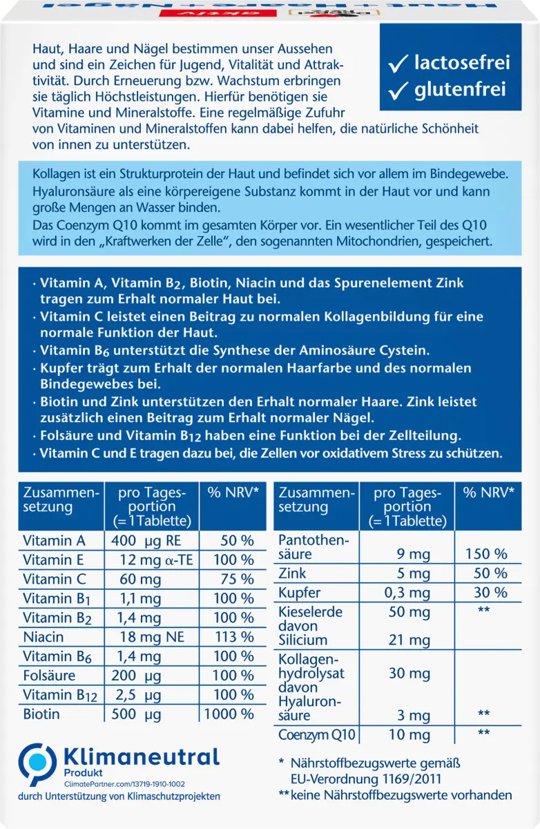 СоставНа суточную дозу*% NRV**Биотин500 мкг1000%Фолиевая кислота200 мкг100%Медь0,3 мг30%Ниацин18 мг113%Пантотеновая кислота9 мг150%Витамин В 2, Рибофлавин1,4 мг100%Витамин А400 мкг50%Витамин В1, Тиамин1,1 мг100%Витамин В 122,5 мкг100%Витамин В 61,4 мг100%Витамин С60 мг75%Витамин Е12 мг 100%Цинк5 мг50%Кремний21 мг****Коэнзим Q1010 мг****Гидролизат коллагена30 мг****Кремнезем50 мг*****соответствует 1 таблетке