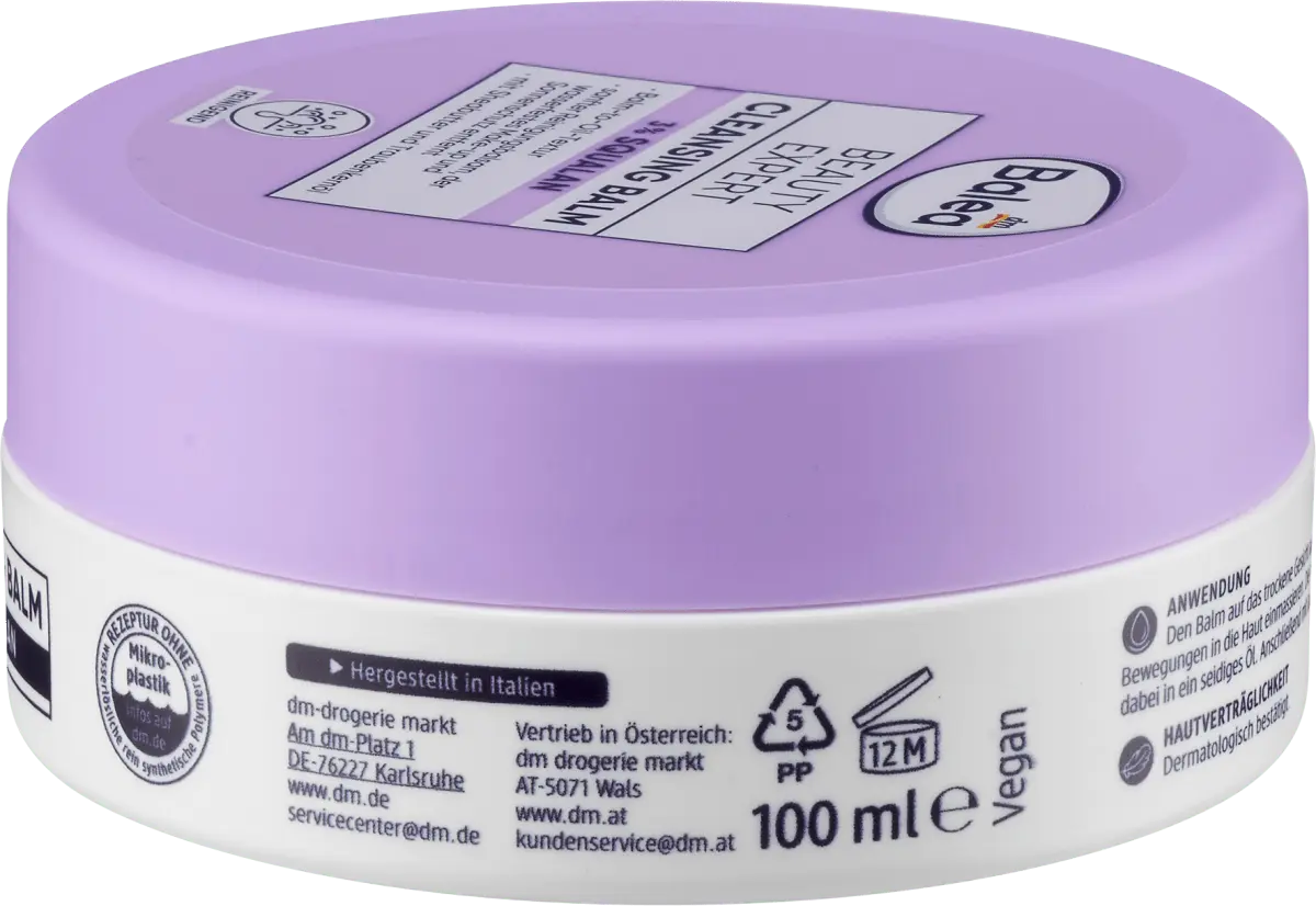 Balea Beauty Expert предлагает эффективный уход с концентрированными ингредиентами, оптимально адаптированными к потребностям кожи. СКВАЛАН – проверенный увлажняющий и регенерирующий активный ингредиент. Очищающий бальзам со скваланом придает коже ощущение мягкости и питания.* Эффективный очищающий бальзам связывает излишки кожного сала и грязи на коже, не затрагивая кожный барьер. Формула с МАСЛОМ ВИНОГРАДНЫХ КОСТОЧЕК и МАСЛОМ ШИ нежно воздействует на кожу и предотвращает ее высыхание. При массаже твердый бальзам превращается в шелковистое масло, которое смывает макияж, защиту от солнца и загрязнения и его можно смыть, не оставляя следов. Для ощущения чистой и мягкой кожи.* *Самооценка 21 тестера после 4 недель использования. Рецепт без микропластика и водорастворимых, чисто синтетических полимеров. Продукт соответствует Руководству по красоте Balea Clean – www.dm.de/balea. Совместимость с кожей подтверждена дерматологически. Протестировано офтальмологом.