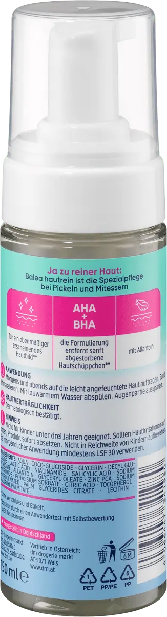 Очищающая пенка Balea Skin-Clean мягко очищает и отшелушивает кожу. Эффективное сочетание AHA (молочной кислоты) и BHA (салициловой кислоты) мягко удаляет омертвевшие клетки кожи и придает коже более сияющий вид. Формула с цинком и модным активным ингредиентом ниацинамидом регулирует содержание масла в коже и делает цвет лица более ровным. Известно, что активный ингредиент аллантоин успокаивает кожу и дополняет формулу. Рецептура без микропластика и водорастворимых, чисто синтетических полимеров.