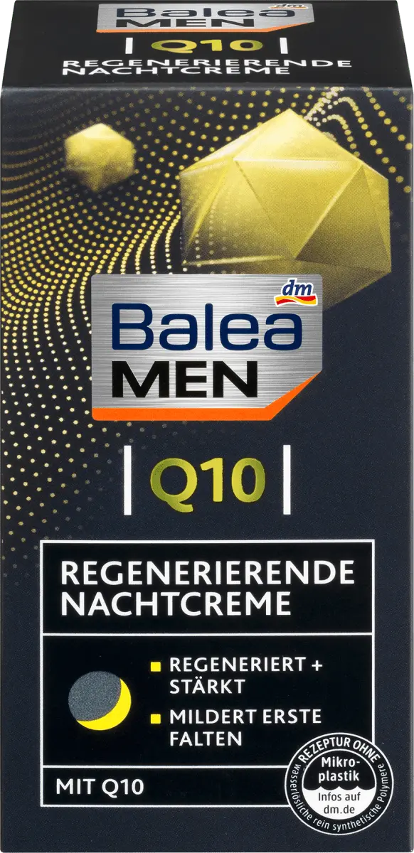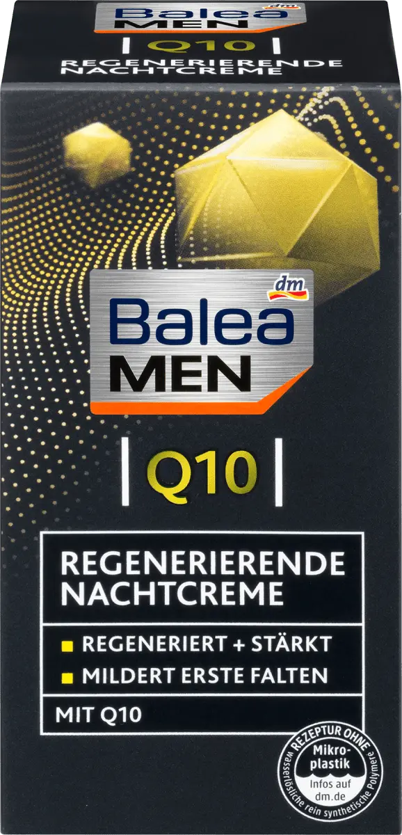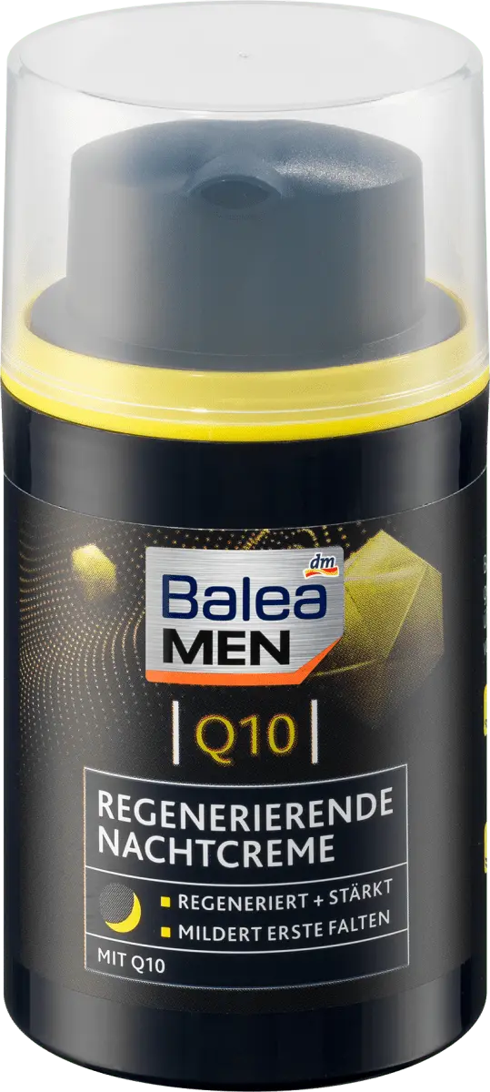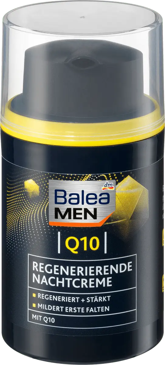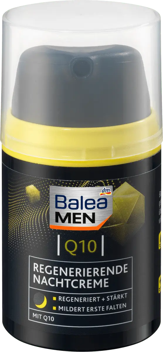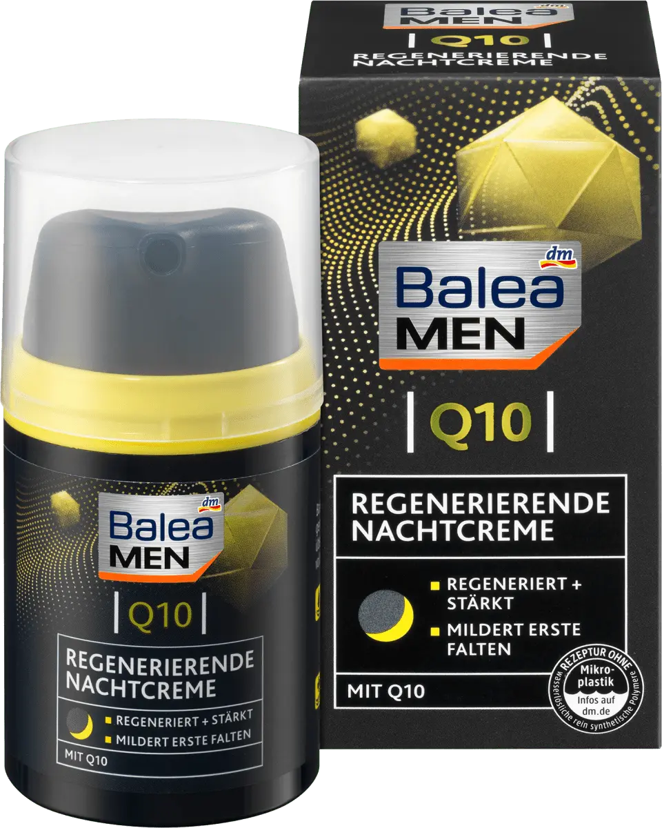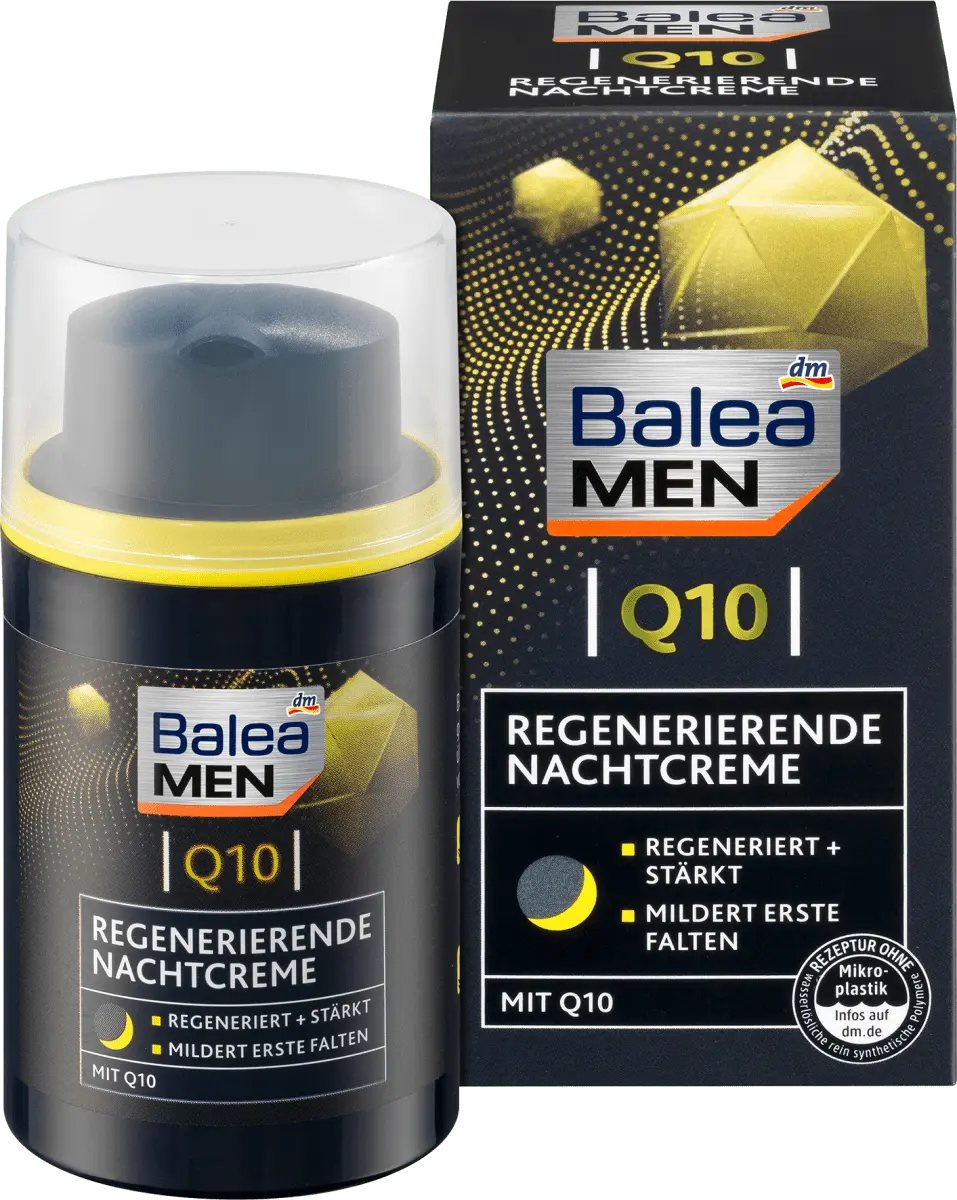Ночной крем Balea MEN Q10 регенерирует и интенсивно питает мужскую кожу кожу на ночь ценными ингредиентами, такими как Q10, масло ши и пантенол. Обеспечивает увлажнение и уменьшает глубину морщин, делая мужскую кожу обновленной и сильной. Рецепт без микропластика и водорастворимых, чисто синтетические полимеры.