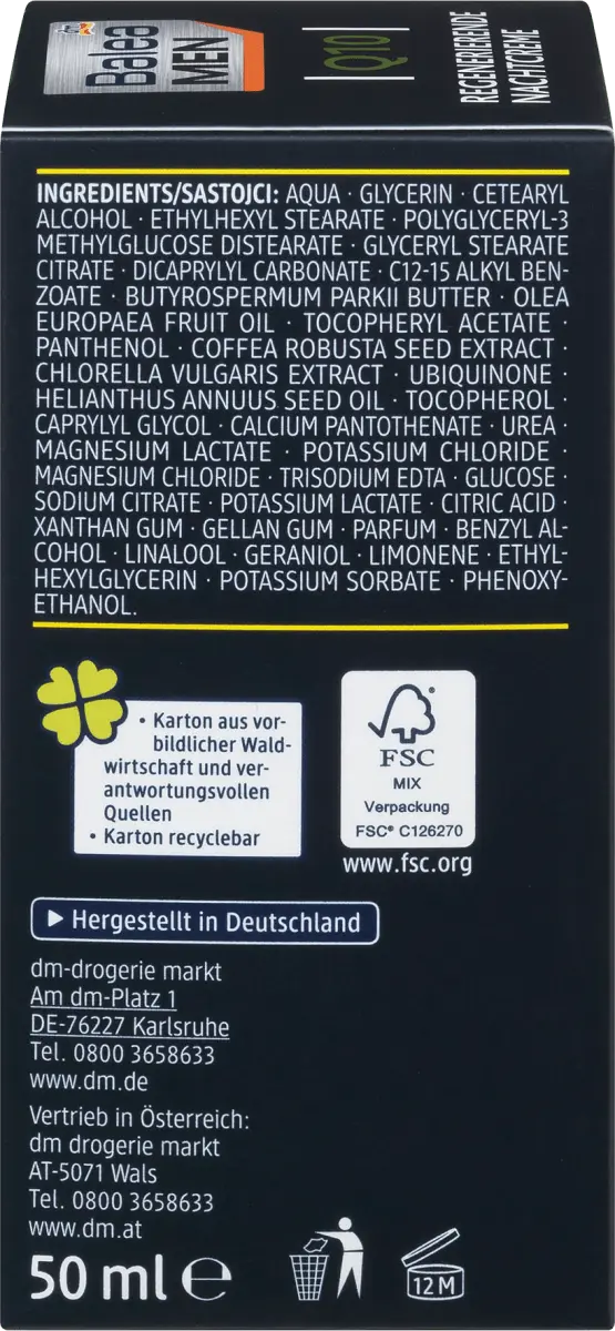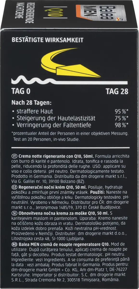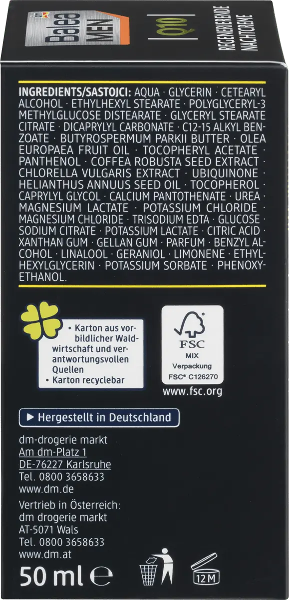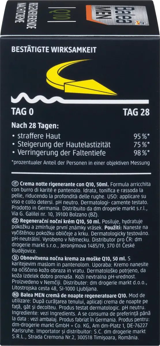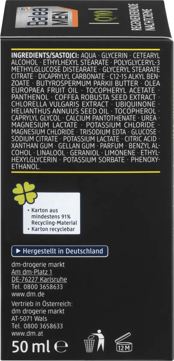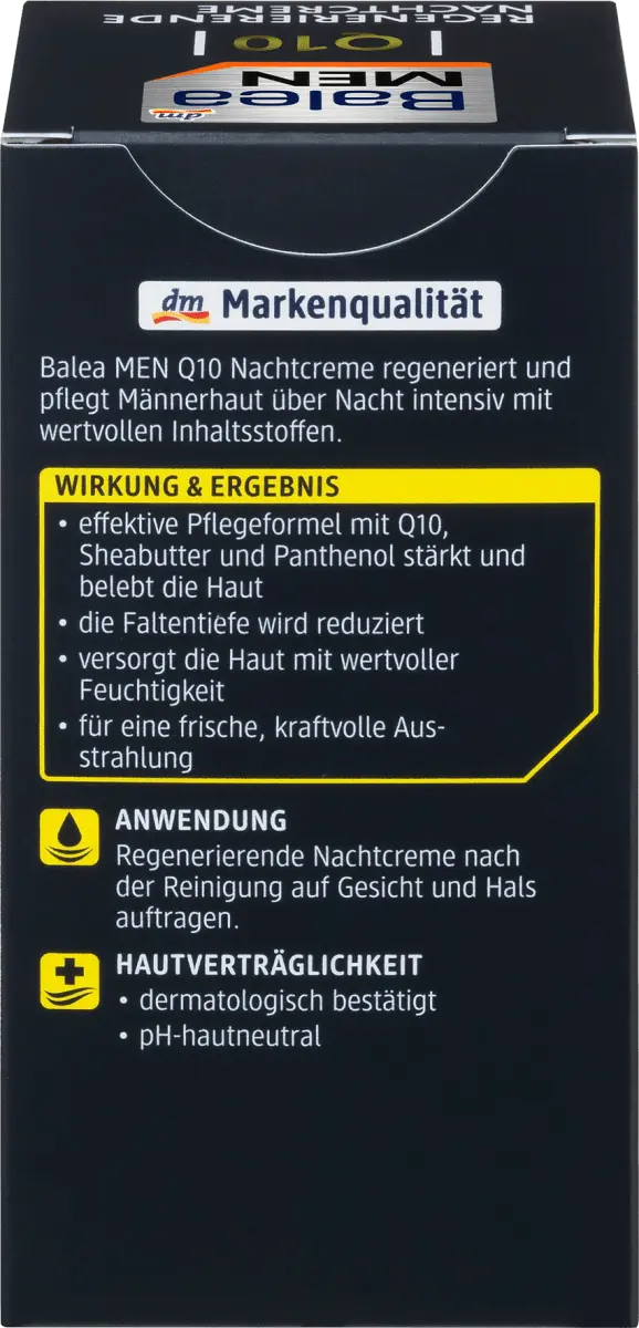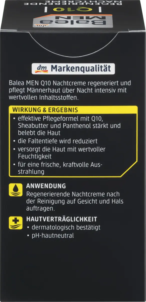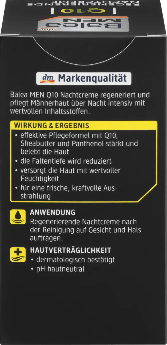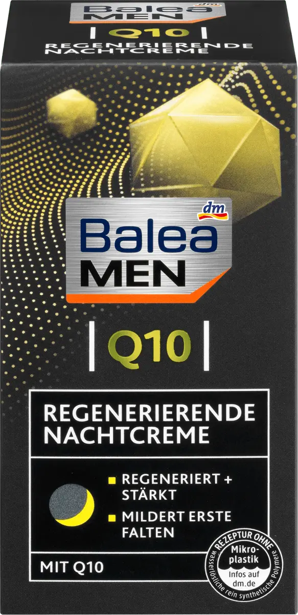 Ночной крем Balea MEN Q10 регенерирует и интенсивно питает мужскую кожу кожу на ночь ценными ингредиентами, такими как Q10, масло ши и пантенол. Обеспечивает увлажнение и уменьшает глубину морщин, делая мужскую кожу обновленной и сильной. Рецепт без микропластика и водорастворимых, чисто синтетические полимеры.