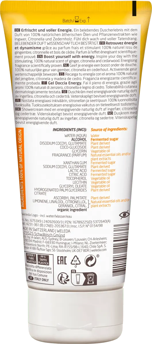 Гель для душа Weleda Aroma Energy — это освежающий душ с ароматом 100% натуральных эфирных масел и растительных экстрактов, таких как имбирь, цитронелла и кедр. Это заставит вас чувствовать себя бодрым и полным энергии. Бодрящий эффект аромата научно подтвержден.