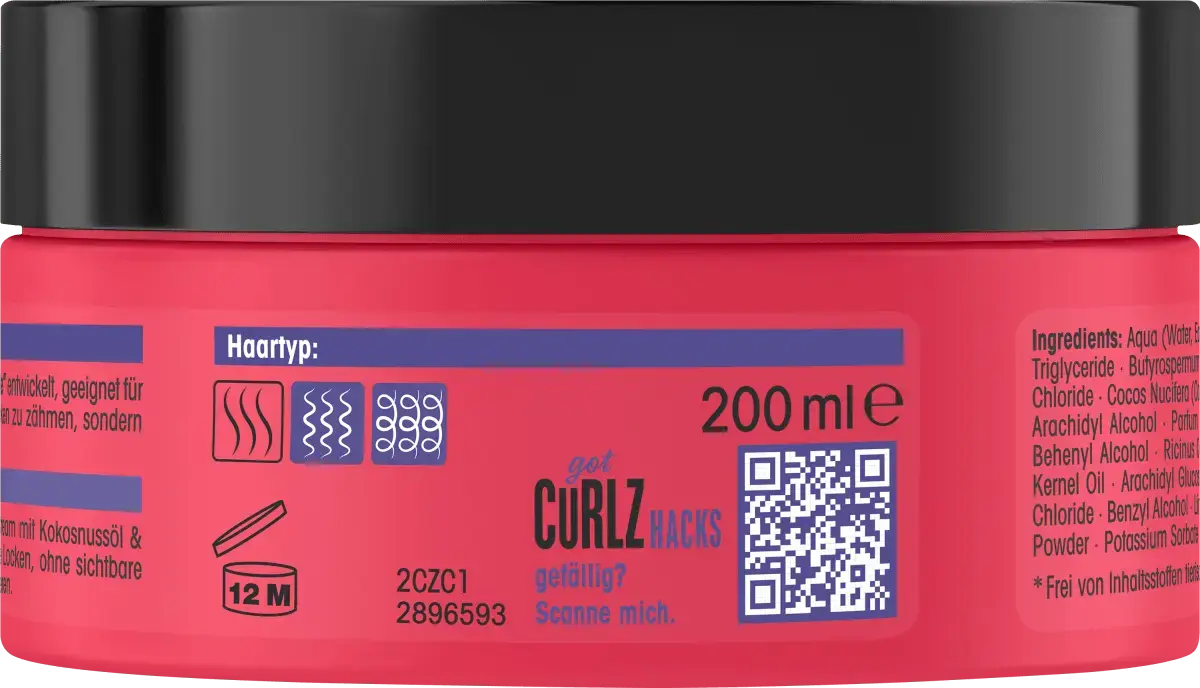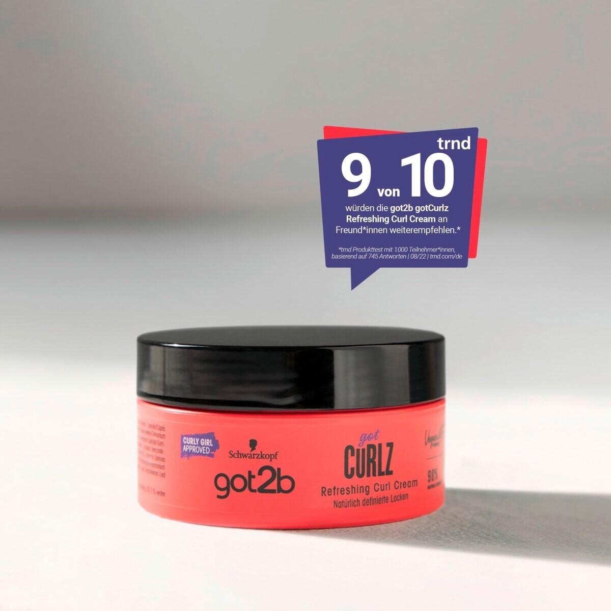 Освежающий крем для локонов gotCurlz от got2b питает, оживляет и подчеркивает локоны, не оставляя видимых следов и не утяжеляя их, с содержанием кокоса масло, касторовое масло, аргановое масло и масло ши. Крем для вьющихся волос выделяет и герметизирует каждый локон, подчеркивая естественный вид. Используйте его в качестве несмываемой дневной маски или интенсивного увлажняющего крема на ночь. Банка также на 50 % изготовлена из переработанного пластика (за исключением этикетки и крышки).