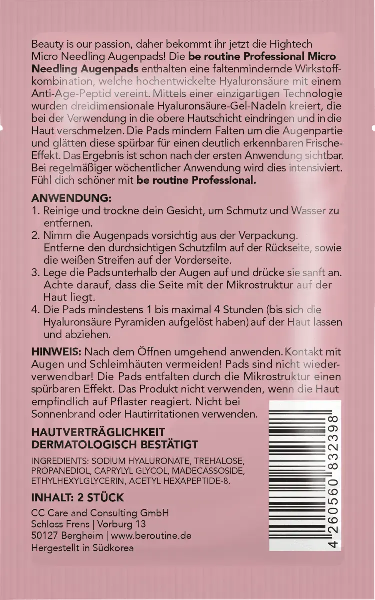 Применение: 1. Очистите и высушите лицо, чтобы удалить грязь и воду. 2. Осторожно извлеките наглазники из упаковки. Снимите прозрачную защитную пленку сзади и белые полосы спереди. 3. Поместите подушечки под глаза и осторожно прижмите их. Следите, чтобы сторона с микроструктурой лежала на коже. 4. Оставьте подушечки на коже минимум на 1, максимум на 4 часа (до растворения пирамидок гиалуроновой кислоты) и снимите их. ПРИМЕЧАНИЕ. Используйте сразу после открытия. Избегать попадания в глаза и на слизистые оболочки! Прокладки не подлежат повторному использованию!