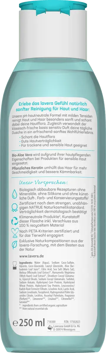 br>РН-нейтральная для кожи формула веганского геля для душа Basis Sensitiv 2in1 от Lavera объемом 250 мл с мягкими поверхностно-активными веществами особенно бережно очищает кожу и волосы и защищает кожную флору. В то же время классический свежий базовый чувствительный аромат превращает ежедневный душ в освежающее, нежное и приятное ощущение. Из-за своих свойств по уходу за кожей органическое алоэ вера используется в таких продуктах для чувствительной кожи. Растительный кератин покрывает волосы, делая их более эластичными и облегчая расчесывание. *Упаковка содержит не менее 70% переработанного материала.