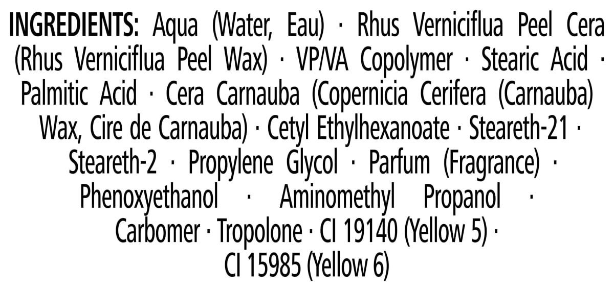 Состав: Aqua (Вода, Eau), Rhus Verniciflua Peel Cera (Rhus Verniciflua Peel Wax), Сополимер VP/VA, стеариновая кислота, пальмитиновая кислота, Cera Carnauba (воск Copernicia Cerifera (Carnauba), Cire de Carnauba), цетилэтилгексаноат, стеарет-21, стеарет-2, пропиленгликоль, отдушка (аромат), феноксиэтанол, аминометилпропанол, Карбомер, Трополон, CI 19140 (Желтый 5), CI 15985 (Желтый 6)