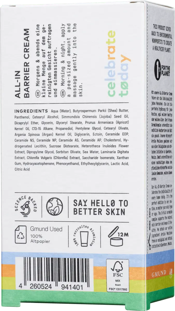 Крем NøCeleb today ALL-In Cream — это насыщенный продукт для ухода за лицом, который увлажняет кожу. Он содержит 5-кратный комплекс керамидов и мексиканскую арнику, которые укрепляют кожный барьер и улучшают водный баланс кожи. Керамиды защищают кожу от внешних раздражителей и предотвращают естественную потерю влаги. Арника Мексикана помогает уменьшить покраснения и придает коже сияющий цвет. Масло ши и масло жожоба обладают увлажняющими свойствами, успокаивают кожу и сохраняют ее влагу. Крем не содержит минеральных масел, силиконов, парабенов, ПЭГ и ингредиентов животного происхождения. Крем доступен в четырех различных цветах, причем выбор цвета осуществляется случайным образом.