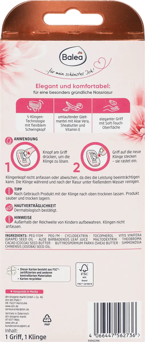 Balea Elegance с 5 лезвиями -Бритва обеспечивает точные результаты. Его всестороннее скользящее покрытие с алоэ вера, маслом ши и витамином Е позволяет ему мягко скользить по коже и помогает избежать раздражения.