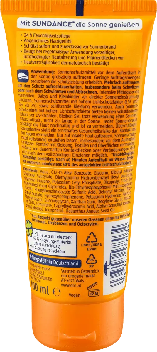 Солнцезащитный крем SUNDANCE SPF 30 предлагает 24-часовой увлажняющий уход и обеспечивает приятное ощущение кожи и обеспечивает немедленную и надежную защиту от солнечных ожогов. При регулярном использовании предотвращает преждевременное фотостарение кожи и появление пигментных пятен. Совместимость с кожей одобрена дерматологами. Водонепроницаемость* (*Независимый испытательный институт подтверждает: после 40 минут пребывания в воде сохраняется не менее 50 % заявленного солнцезащитного фактора). Из уважения к нашим океанам, без УФ-фильтров октиноксата, оксибензона и октокрилена. Веган.