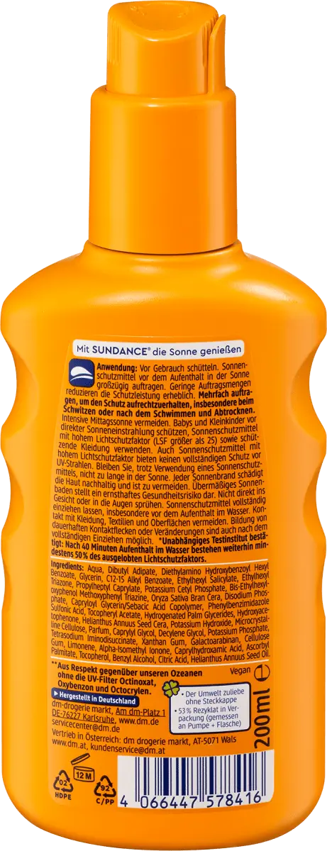 Солнцезащитный спрей SUNDANCE с SPF 50+ предотвращает преждевременное, связанное со светом старение кожи и появление пигментных пятен при регулярном использовании. Совместимость с кожей одобрена дерматологами. Водонепроницаемость* (*Независимый испытательный институт подтверждает: после 40 минут пребывания в воде сохраняется не менее 50 % заявленного солнцезащитного фактора). Из уважения к нашим океанам, без УФ-фильтров октиноксата, оксибензона и октокрилена. Веган.
