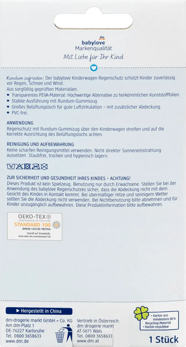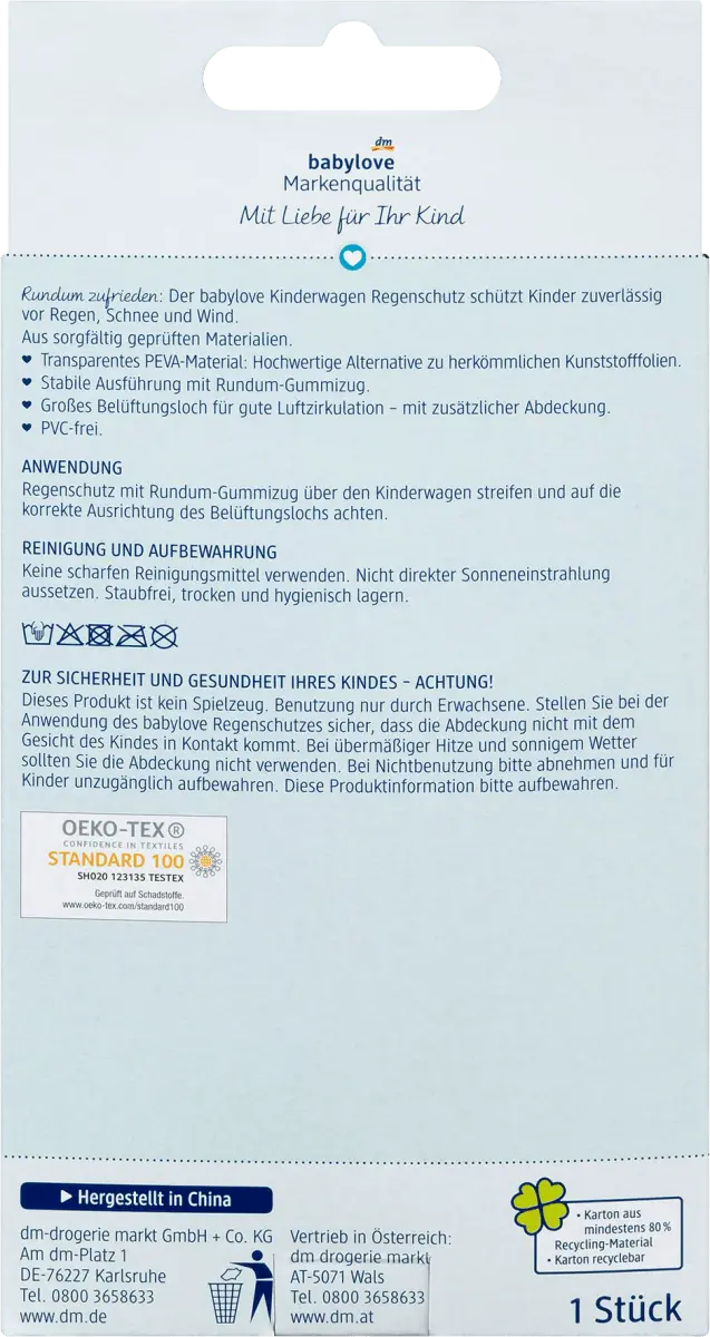 ДЛЯ БЕЗОПАСНОСТИ И ЗДОРОВЬЯ ВАШЕГО РЕБЕНКА – ВНИМАНИЕ! Этот продукт не является игрушкой. Использование только взрослыми. При использовании дождевика babylove следите за тем, чтобы чехол не касался лица ребенка. Не используйте чехол в жаркую и солнечную погоду. Когда он не используется, пожалуйста, снимите его и храните в недоступном для детей месте. Пожалуйста, сохраните эту информацию о продукте.