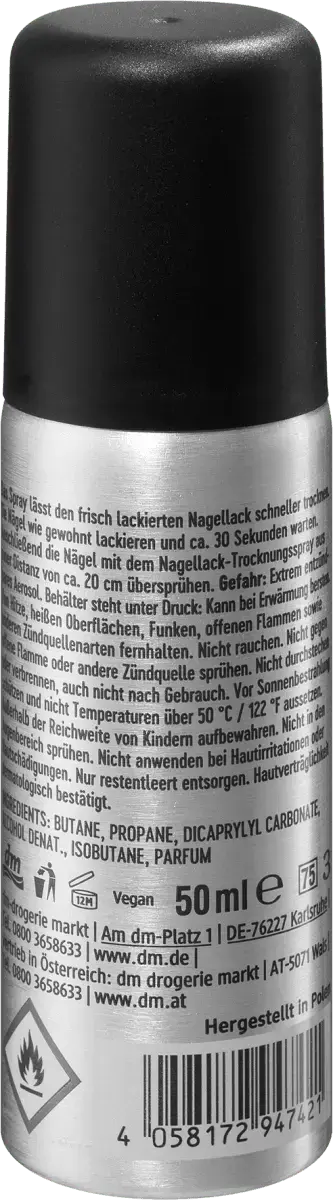 Трендовая сушилка для лака Quick Dry Spray позволяет свеженакрашенному лаку высохнуть быстрее. Просто накрасьте ногти как обычно и подождите около 30 секунд. Затем распылите на ногти спрей для сушки лака с расстояния примерно 20 см.