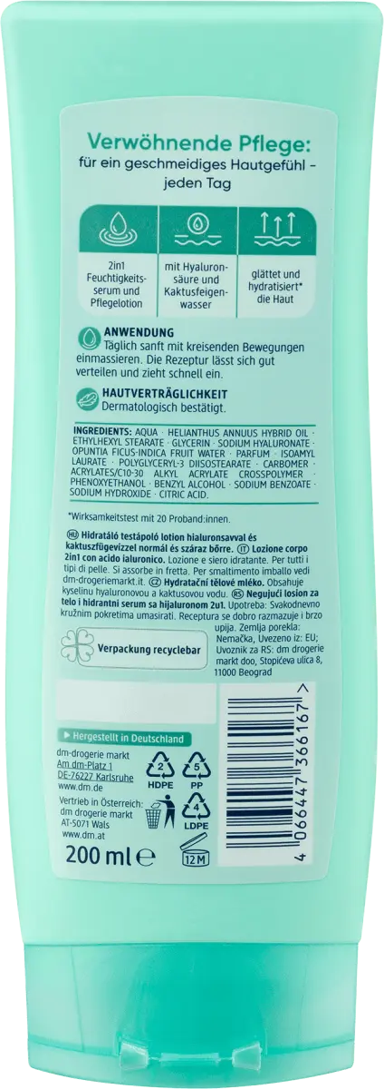 Лосьон для ухода Balea Hyaluron — легкий, Нежный уходовый продукт, обеспечивающий насыщенное увлажнение – для удивительно мягкой и эластичной кожи. Формула, которая мягко тает на коже, увлажняет и делает кожу шелковистой и мягкой. Повышенная влажность гарантирует, что кожа станет шелковистой и напитанной. Гиалуроновая кислота и вода опунции обеспечивают глубокий уход.