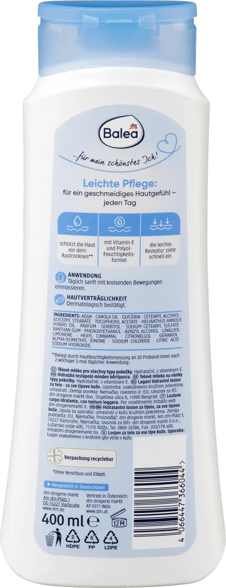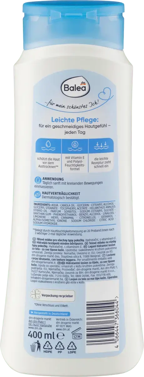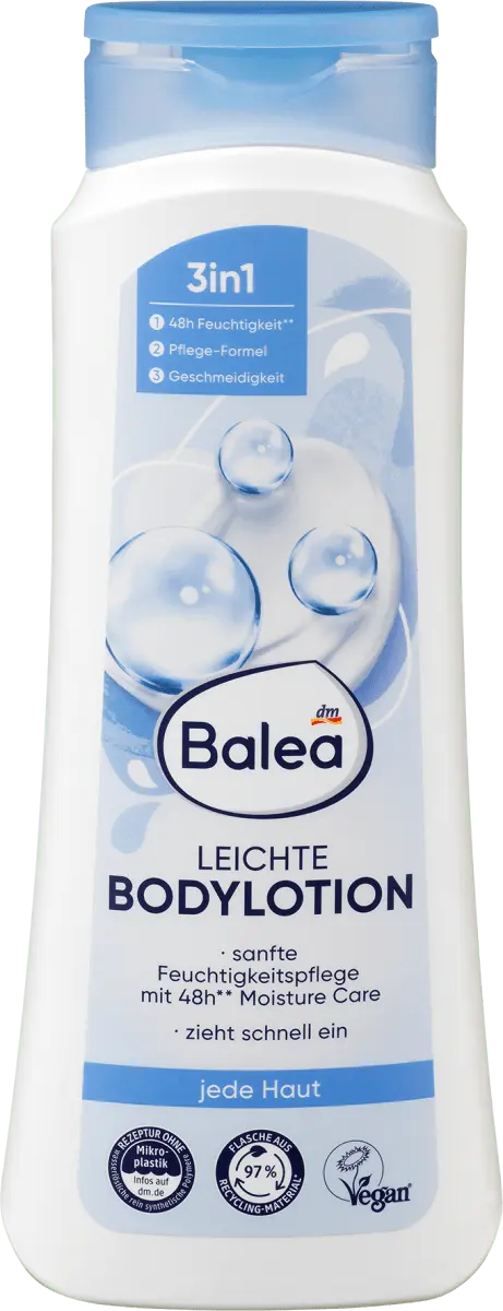 Легкий лосьон для тела Balea дарит коже длительное ощущение комфорта – для ежедневного ухода. Он надежно снабжает нормальную кожу влагой и делает ее бархатистой и мягкой каждый день. Формула Moisture Care 48 Hour Formula поддерживает естественный запас влаги в коже, а сбалансированная формула питает и защищает кожу от высыхания. Кроме того, вас питают витамин Е и подсолнечное масло. Легкая эмульсия легко наносится и быстро впитывается. Рецепт без микропластика и водорастворимых, чисто синтетические полимеры.