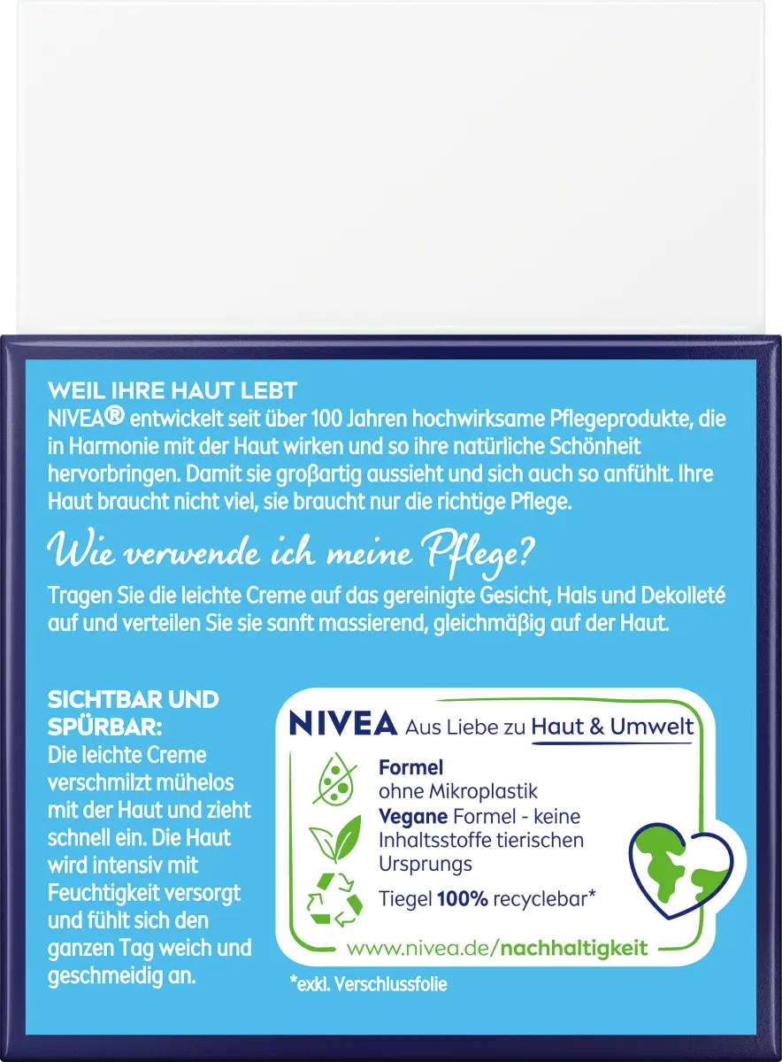 Нанесите легкий крем на очищенное лицо, шею и зону декольте и равномерно распределите по коже легкими массирующими движениями. Чтобы оптимально дополнить уход, перед нанесением крема очистите кожу чистящим средством NIVEA.