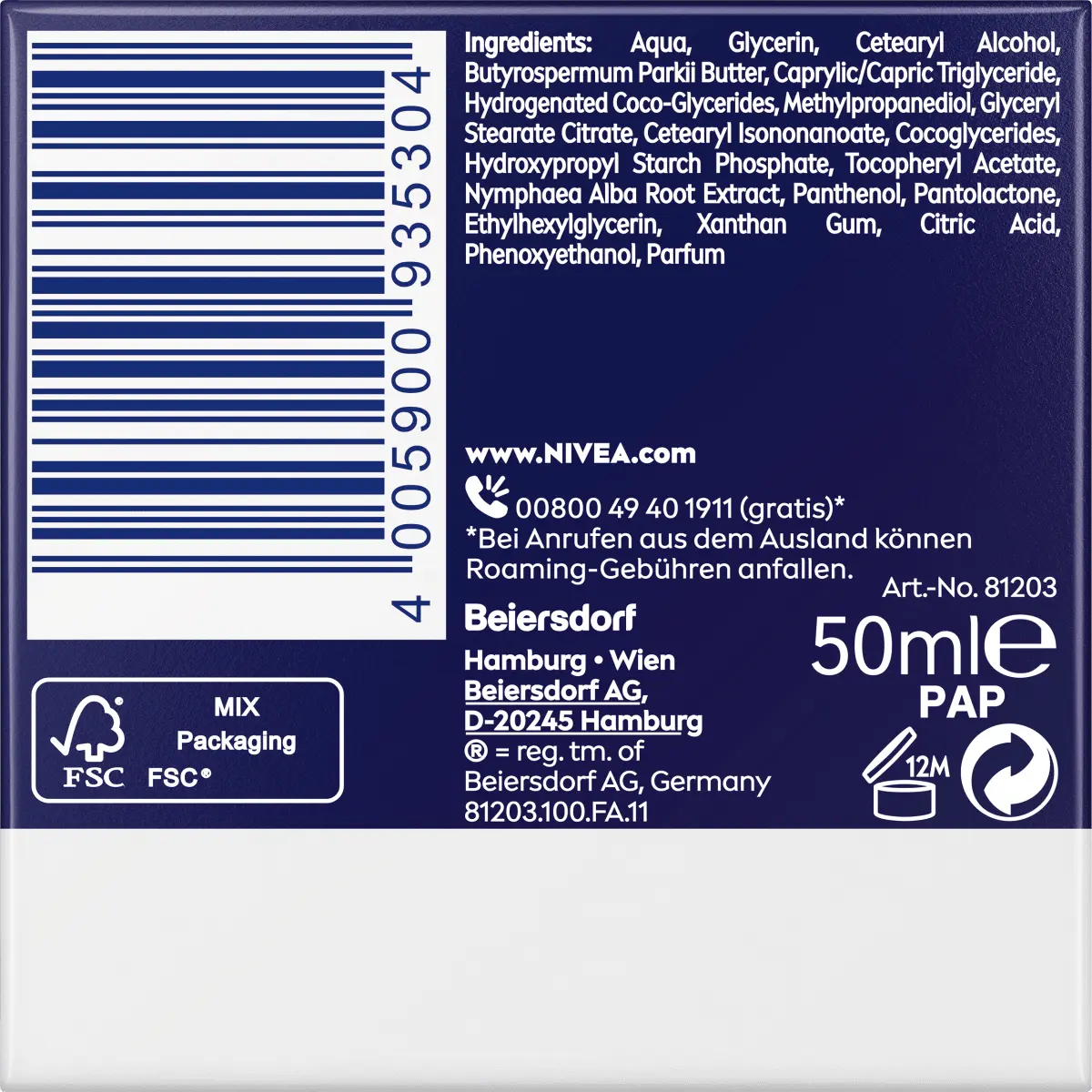 Состав: Аква, глицерин, цетеарил. Спирт, масло Butyrospermum Parkii, каприловый/каприновый триглицерид, гидрогенизированные кокосовые глицериды, метилпропандиол, глицерилстеарат цитрат, цетеарилизононаноат, кокоглицериды, фосфат гидроксипропилкрахмала, токоферилацетат, экстракт корня нимфеи белой, пантенол, пантолактон, этилгексилглицерин, ксантан. Камедь, лимонная кислота, феноксиэтанол, отдушка