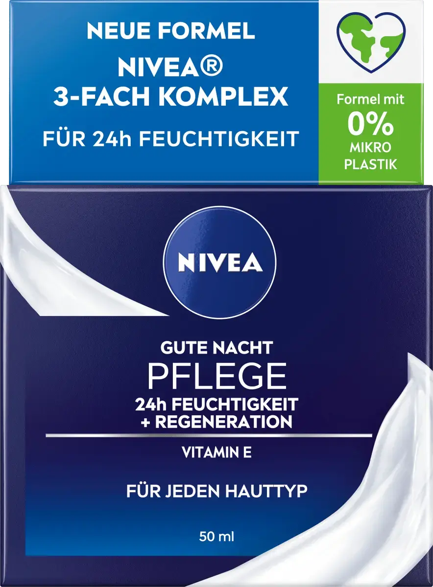 NIVEA Essentials Good Night Care 24h Moisture + Regeneration — идеальное дополнение к вашему ежедневному уходу за лицом. Он обеспечивает увлажнение на срок до 24 часов и, таким образом, балансирует естественный уровень влажности кожи в ночное время. Формула с тройным комплексом NIVEA, витамином Е и провитамином В5 обеспечивает интенсивное увлажнение и быстро впитывается. Уход также поддерживает естественную регенерацию кожи в ночное время. Легкий крем легко тает на коже, увлажняет ее, становится мягкой и эластичной.