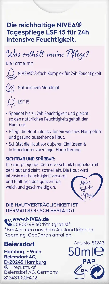Насыщенный дневной уход NIVEA Essentials с 24-часовым увлажнением был разработан для интенсивного ухода за сухой кожей. Формула с тройным комплексом NIVEA и натуральным миндальным маслом обеспечивает увлажнение на срок до 24 часов и, таким образом, балансирует естественную влажность кожи. Крем интенсивно питает кожу, делает ее мягкой и защищает от внешних воздействий. Благодаря SPF 15 дневной уход также защищает вашу кожу от фотостарения.