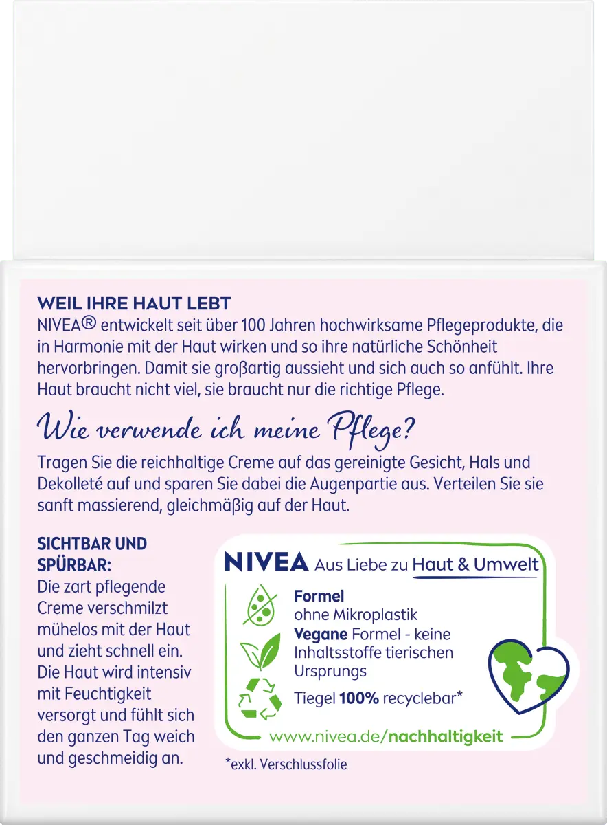 Нанесение Утром нанесите питательный крем на очищенное лицо, избегая области вокруг глаз. Аккуратно распределите его, равномерно массируя по коже. Чтобы оптимально дополнить уход, перед нанесением крема очистите кожу чистящим средством NIVEA.