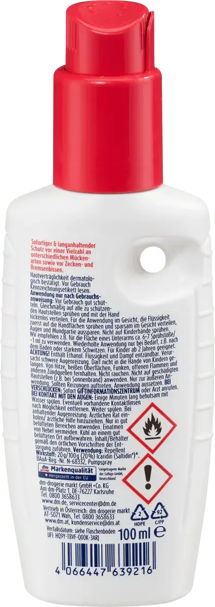 Регистрационный номер BauA. Н-68332. Используйте биоцидные продукты с осторожностью. Всегда читайте этикетку и информацию о продукте перед использованием. Хорошо встряхнуть перед использованием. Равномерно распылите на все участки кожи, которые необходимо защитить, и полностью распределите рукой. Не распыляйте на лицо. Для использования на лице распылите жидкость на ладонь и аккуратно распределите по лицу, избегая области глаз и рта. Не распыляйте на руки детей. Например, мы рекомендуем примерно 6-7 распылений/= 1 мл на область предплечья. Повторное использование только при необходимости, например, после купания или сильного потоотделения.