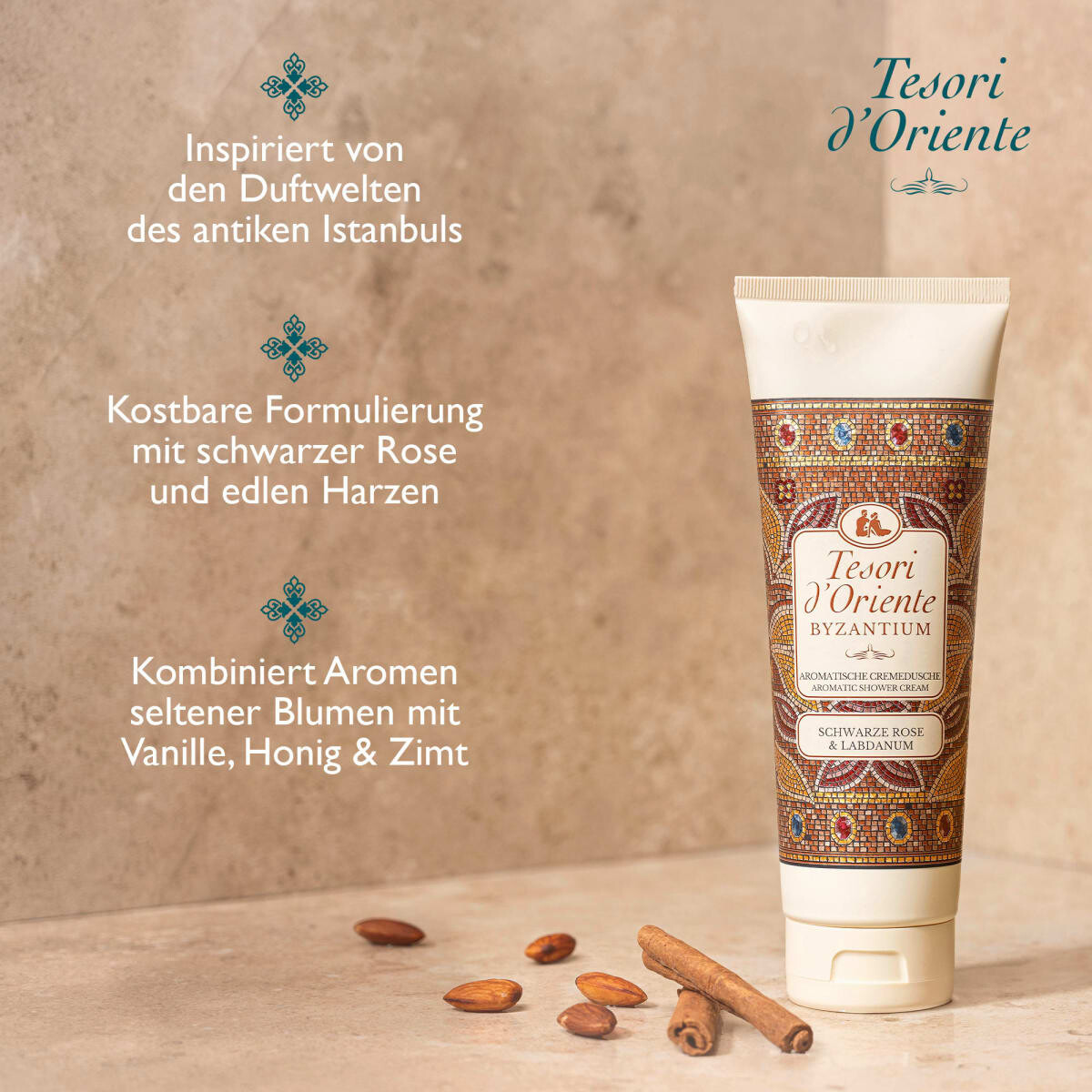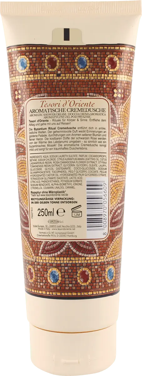 Ритуальный крем-душ Tesori d'Oriente Byzantium перенесет вас в древние восточные миры. Таинственный аромат навевает воспоминания о золотых дворцах, наполненных ароматами редких цветов и изысканных смол. Драгоценные ароматы черной розы окружены теплом лабданума — чувственным, как византийская мозаика. Ароматный крем-душ мягко очищает и дарит приятные ощущения под душем. Благодаря созданию мечтательных и многогранных ароматов ванная дома в мгновение ока превращается в оазис благополучия.