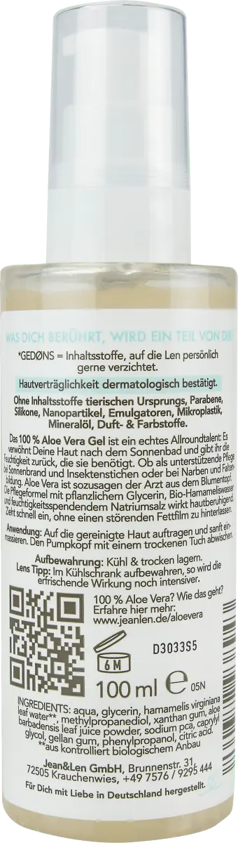 Гель Jean&Len Après Sun Aloe vera – настоящий универсал: он балует вашу кожу после загара и возвращает ей необходимую влагу. Идеально подходит в качестве поддерживающего средства при солнечных ожогах и укусах насекомых, а также при шрамах и морщинах. Формула ухода с глицерином, водой гамамелиса и PCA натрия оказывает успокаивающее действие на кожу. Гель быстро впитывается, не оставляя раздражающей жирной пленки.