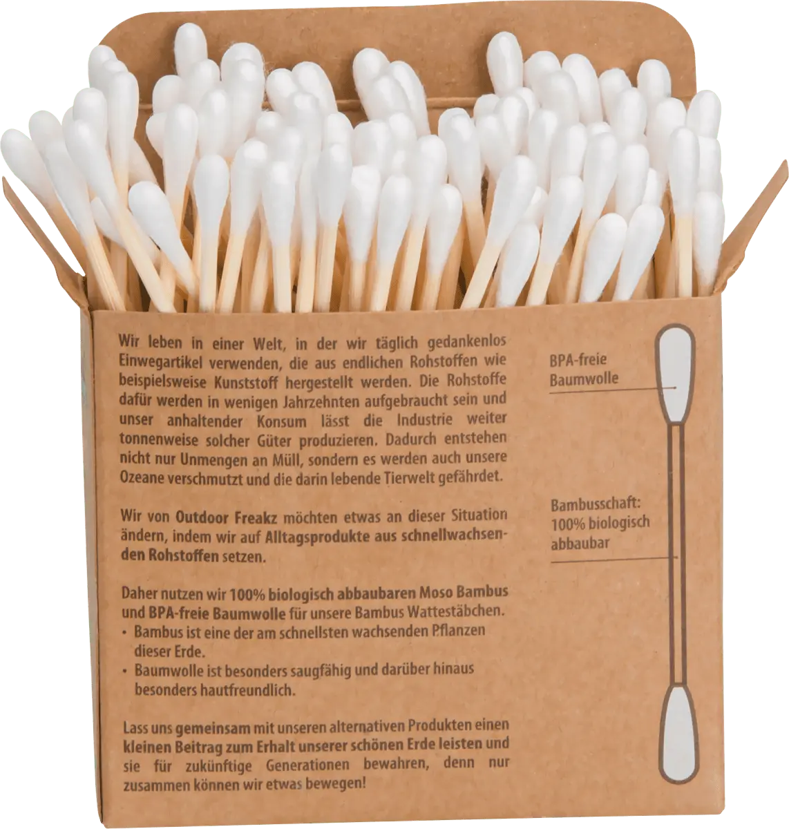 Бамбуковые ватные палочки Outdoor Freakz веганские и не образуют отходов. Они изготавливаются исключительно из хлопка и бамбука. Они стабильны и на 100% биоразлагаемы.