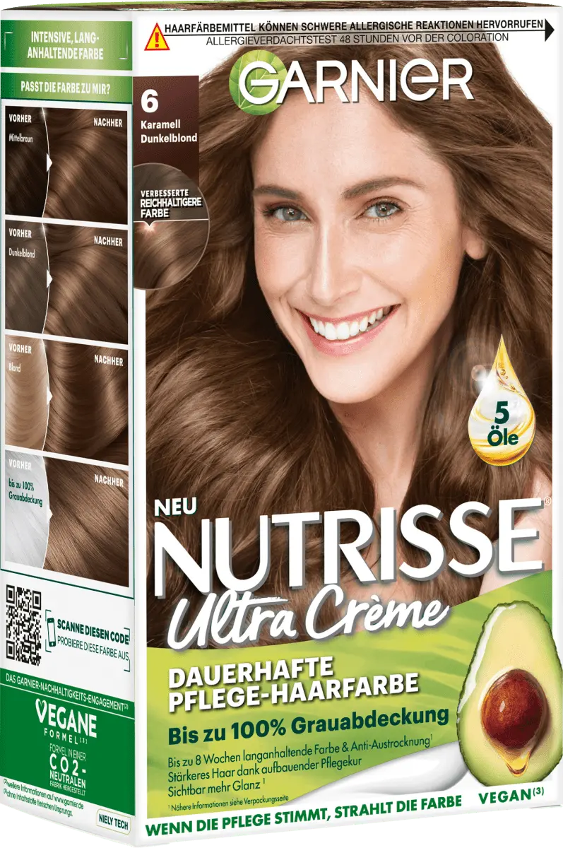br>Краска для волос Nutrisse Ultra Creme в цвете 6 Caramel Dark Blonde не только придает волосам насыщенный цвет, но и шелковистый, сияющий блеск. Краска для перманентного ухода за волосами обеспечивает до 100% закрашивание седины и обеспечивает стойкий цвет с гармоничным цветовым градиентом. Фруктовая кремовая текстура со свежим запахом не стекает и легко и равномерно наносится. Благодаря формуле с пятью фруктовыми маслами оливы, ореха ши, авокадо, арганы и клюквы волосы глубоко питаются.