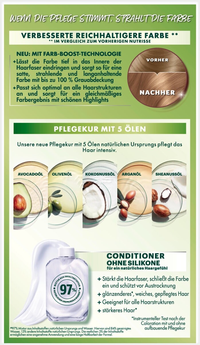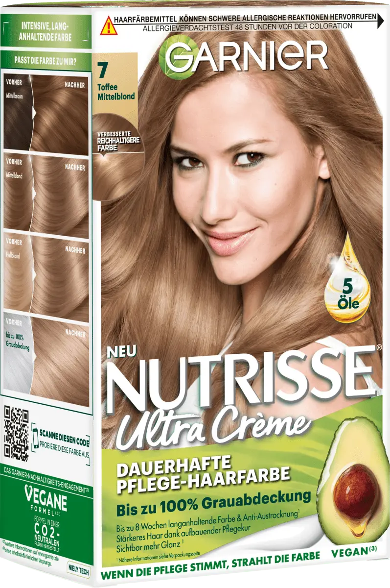 br>Краска для волос Nutrisse Ultra Creme в цвете 7 Toffee Medium Blonde не только придает волосам насыщенный цвет, но и шелковистый, сияющий блеск. Краска для перманентного ухода за волосами обеспечивает до 100% закрашивание седины и обеспечивает стойкий цвет с гармоничным цветовым градиентом. Фруктовая кремовая текстура со свежим запахом не стекает и легко и равномерно наносится. Благодаря формуле с пятью фруктовыми маслами оливы, ореха ши, авокадо, арганы и клюквы волосы глубоко питаются.