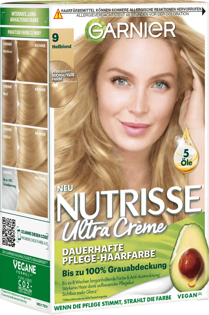 br>Крем-краска для волос Nutrisse Ultra Cream Color 9 Light Blonde не только придает волосам насыщенный цвет, но и шелковистый, сияющий блеск. Краска для перманентного ухода за волосами обеспечивает до 100% закрашивание седины и обеспечивает стойкий цвет с гармоничным цветовым градиентом. Фруктовая кремовая текстура со свежим запахом не стекает и легко и равномерно наносится. Благодаря формуле с пятью фруктовыми маслами оливы, ореха ши, авокадо, арганы и клюквы волосы глубоко питаются.