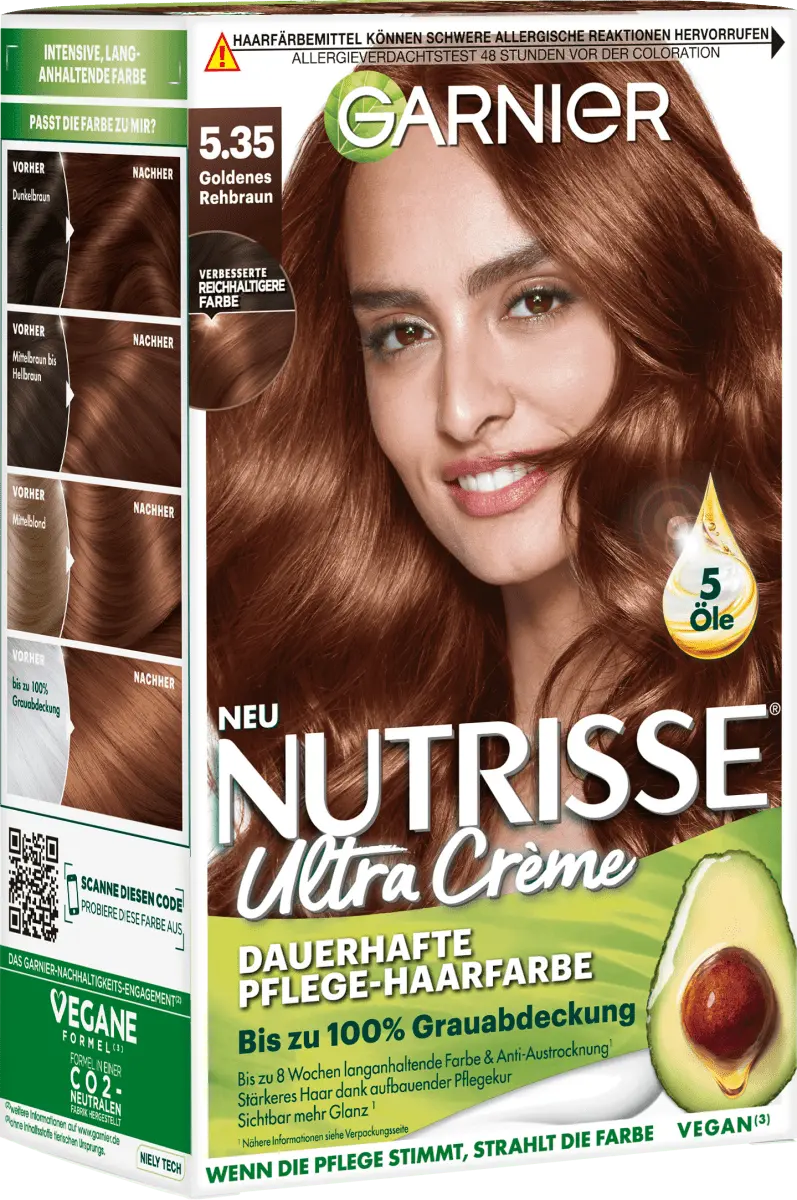 br>Крем-краска для волос Nutrisse Ultra цвета 5.35 Golden Fawn не только придает волосам насыщенный цвет, но и шелковистый, сияющий блеск. Краска для перманентного ухода за волосами обеспечивает до 100% закрашивание седины и обеспечивает стойкий цвет с гармоничным цветовым градиентом. Фруктовая кремовая текстура со свежим запахом не стекает и легко и равномерно наносится. Благодаря формуле с пятью фруктовыми маслами оливы, ореха ши, авокадо, арганы и клюквы волосы глубоко питаются.
