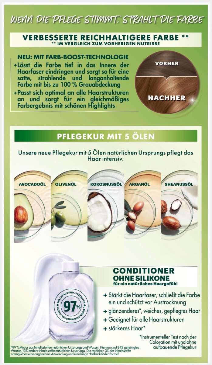br>Крем-краска для волос Nutrisse Ultra цвета 6.3 Темно-золотистый блондин не только придает волосам насыщенный цвет, но и шелковистый, сияющий блеск. Краска для перманентного ухода за волосами обеспечивает до 100% закрашивание седины и обеспечивает стойкий цвет с гармоничным цветовым градиентом. Фруктовая кремовая текстура со свежим запахом не стекает и легко и равномерно наносится. Благодаря формуле с пятью фруктовыми маслами оливы, ореха ши, авокадо, арганы и клюквы волосы глубоко питаются.