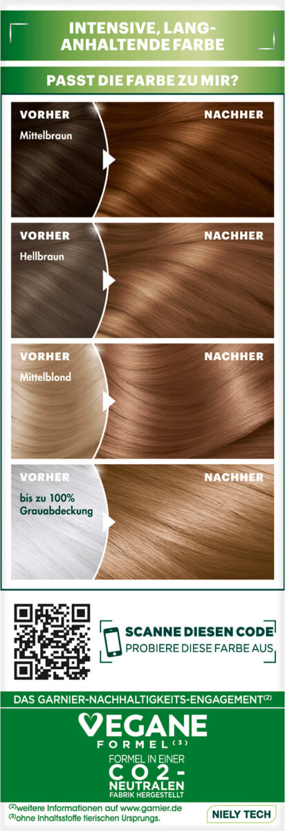 Накройте одежду старым полотенцем, наденьте одноразовые перчатки и смешайте краситель. прилагаемый флакон согласно инструкции по применению. Теперь нанесите готовую смесь прямо на сухие волосы по пробору и распределите пальцами от корней. Дайте цвету подействовать, а затем смойте теплой водой. Избегайте использования шампуня. Для ухода за волосами в комплект входит средство для защиты цвета. Это закрывает волокна волос – для оптимальной интенсивности цвета и ухода! Равномерно массируйте средство для защиты цвета и снова ополосните волосы через две минуты. Нанесите средство по уходу и снова смойте через 2 минуты.